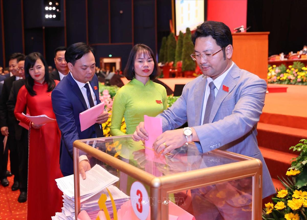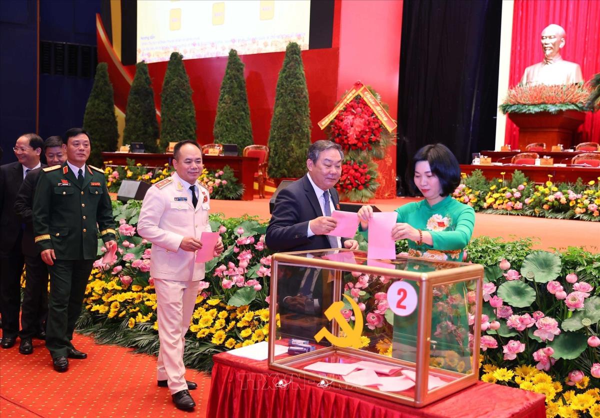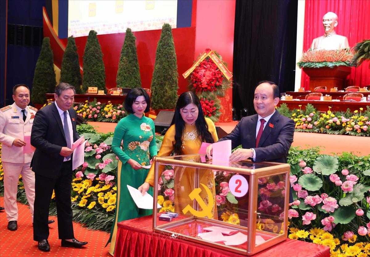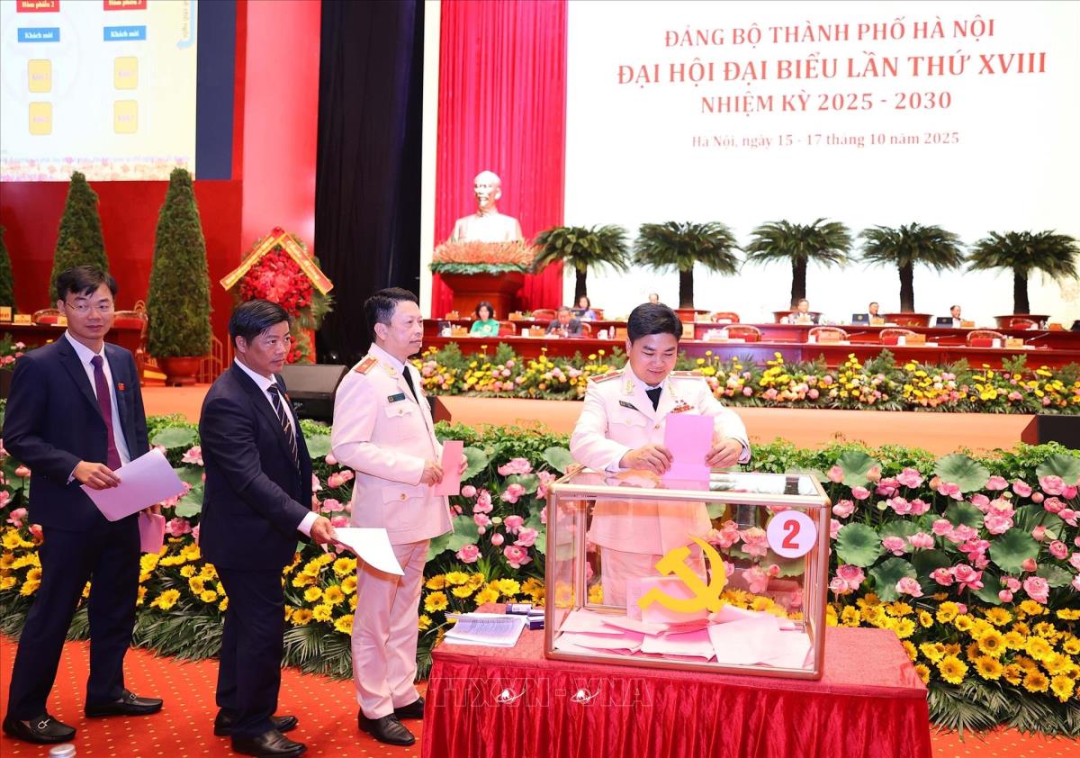 Đại biểu bỏ phiếu bầu Ban Chấp hành Đảng bộ thành phố Hà Nội khóa XVIII, nhiệm kỳ 2025-2030 (16/10/2025). Ảnh: Văn Điệp – TTXVN