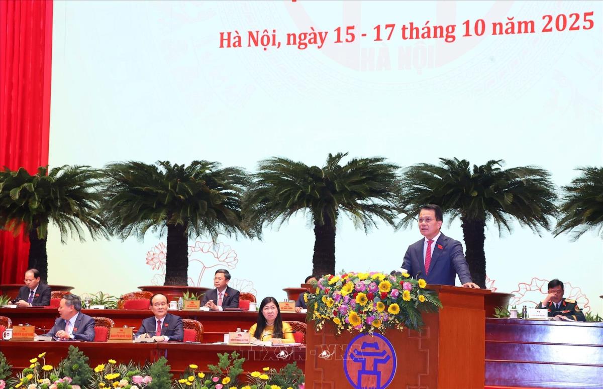 Phó Bí thư Thường trực Thành ủy Hà Nội Nguyễn Văn Phong trình bày Đề án nhân sự Ban Chấp hành Đảng bộ thành phố Hà Nội khóa XVIII, nhiệm kỳ 2025-2030 (16/10/2025). Ảnh: Văn Điệp – TTXVN