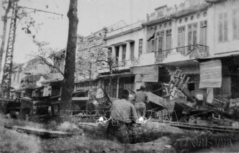 Quân và dân Thủ đô lập chốt chiến đấu trên phố Hàng Bài trong những ngày toàn quốc kháng chiến (1946). Ảnh: TTXVN