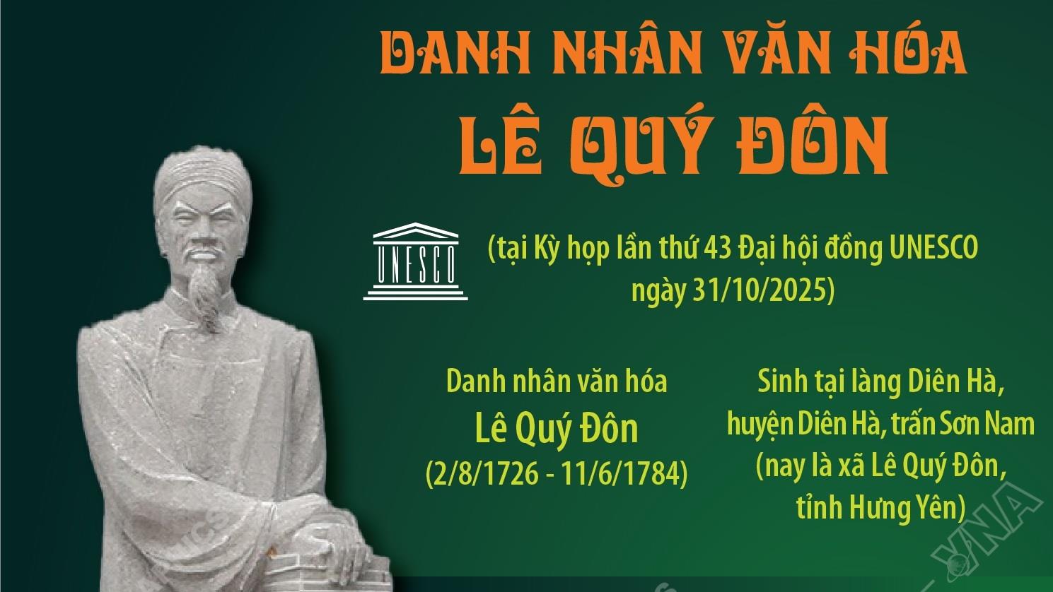 Hà Nội (TTXVN 2/11/2025) Ngày 31/10/2025, Kỳ họp lần thứ 43 Đại hội đồng Tổ chức Khoa học, Giáo dục và Văn hóa của Liên hợp quốc (UNESCO) diễn ra tại thành phố Samarkand, Cộng hòa Uzbekistan, đã thông qua Nghị quyết vinh danh và cùng tham gia kỷ niệm 300 năm Ngày sinh Danh nhân văn hóa Lê Quý Đôn. Lê Quý Đôn là nhà bác học lớn nhất của Việt Nam ở thế kỷ XVIII và là niềm tự hào của dân tộc Việt Nam.