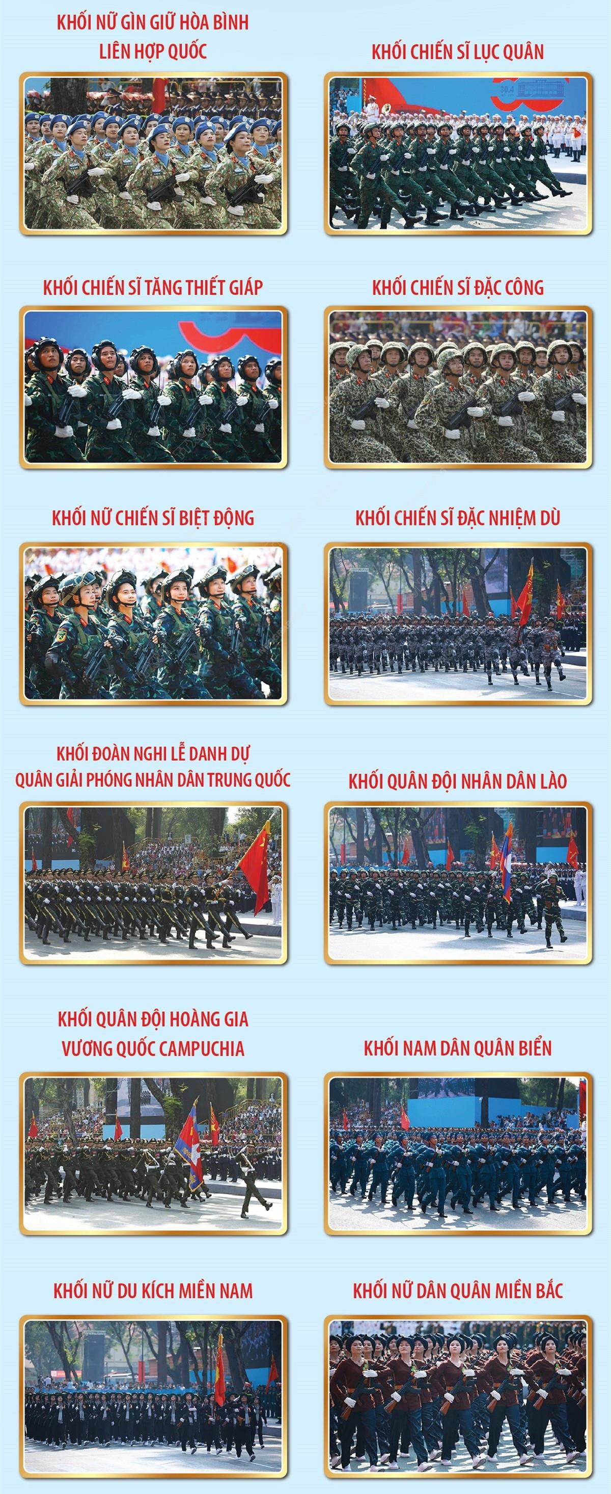 Ngoài ra, còn có các khối diễu binh của Quân đội Trung Quốc, Lào, Campuchia cùng tham gia chương trình.