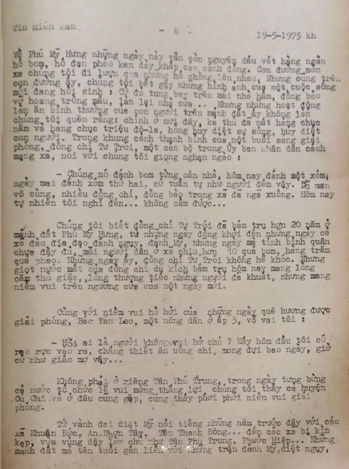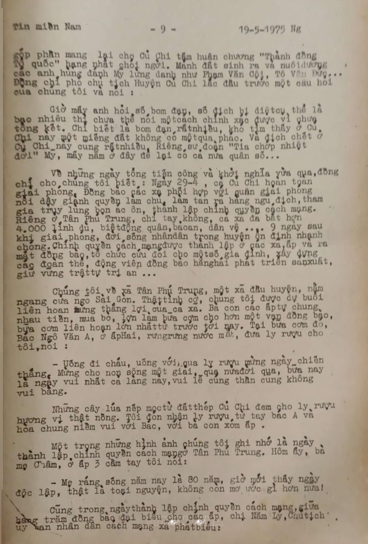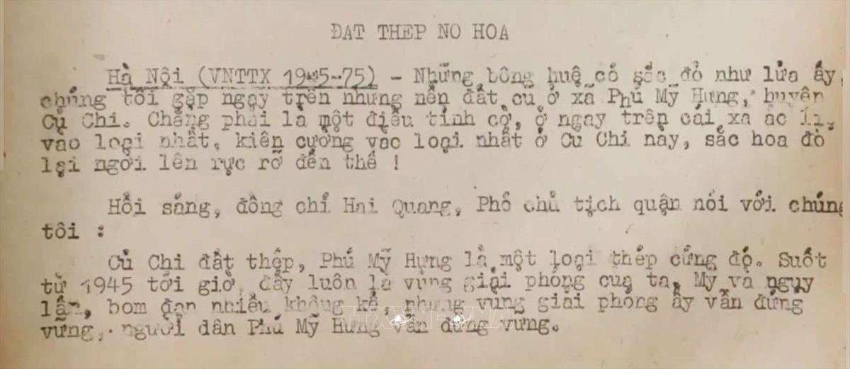 Đất thép nở hoa Tin Trong nước (tin miền Nam) của Việt Nam Thông tấn xã, ngày 19/5/1975 Từ khóa:Giải phóng miền Namthống nhất đất nướcThông tấn xã Giải phóngCủ ChiThành đồng Tổ quốcThành phố Hồ Chí Minh