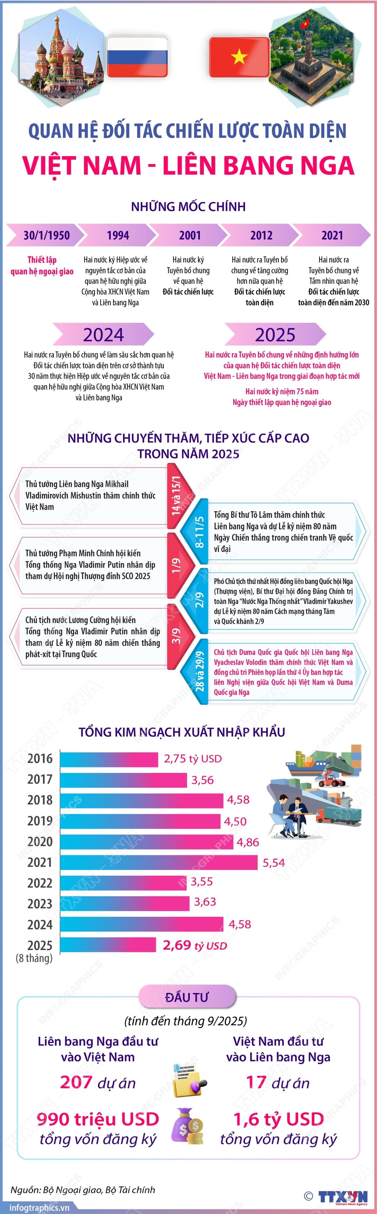 Tiếp đó, năm 2025, hai nước kỷ niệm 75 năm thiết lập quan hệ ngoại giao (30/1/1950-30/1/2025) với nhiều sự kiện, hoạt động có ý nghĩa. Chỉ tính riêng trong năm nay, các chuyến thăm và tiếp xúc cấp cao giữa lãnh đạo cấp cao và các cấp của hai nước diễn ra thường xuyên, liên tục như: Thủ tướng Nga Mikhail Vladimirovich Mishustin thăm chính thức Việt Nam (tháng 1/2025); Tổng Bí thư Tô Lâm và Phu nhân thăm chính thức Liên bang Nga và dự Lễ kỷ niệm 80 năm Ngày Chiến thắng trong chiến tranh Vệ quốc vĩ đại (tháng 5/2025); Thủ tướng Phạm Minh Chính hội kiến Tổng thống Nga Vladimir Putin nhân dịp dự Hội nghị Thượng đỉnh Tổ chức Hợp tác Thượng Hải (SCO) tại Thiên Tân (Trung Quốc) (ngày 1/9/2025); Đồng chí Vladimir Yakushev, Phó Chủ tịch thứ nhất Hội đồng Liên bang Quốc hội Nga (Thượng viện), Bí thư Đại hội đồng Đảng chính trị toàn Nga “Nước Nga Thống nhất” dự Lễ kỷ niệm 80 năm Cách mạng Tháng Tám và Quốc khánh 2/9 (tháng 9/2025); Chủ tịch nước Lương Cường gặp Tổng thống Nga Vladimir Putin nhân dịp tham dự Lễ kỷ niệm 80 năm chiến thắng phát xít của nhân dân thế giới tại Trung Quốc (ngày 3/9/2025); Trợ lý Tổng thống Nga, Chủ tịch Hội đồng Biển Liên bang Nga Nikolai Patrusev thăm Việt Nam (ngày 15 - 18/9/2025); Bí thư Trung ương Đảng, Quyền Bộ trưởng Ngoại giao Việt Nam Lê Hoài Trung gặp Bộ trưởng Ngoại giao Liên bang Nga Sergey Lavrov trong khuôn khổ Phiên Thảo luận chung cấp cao Đại hội đồng Liên hợp quốc Khóa 80 tại Hoa Kỳ (ngày 24/9/2025)…