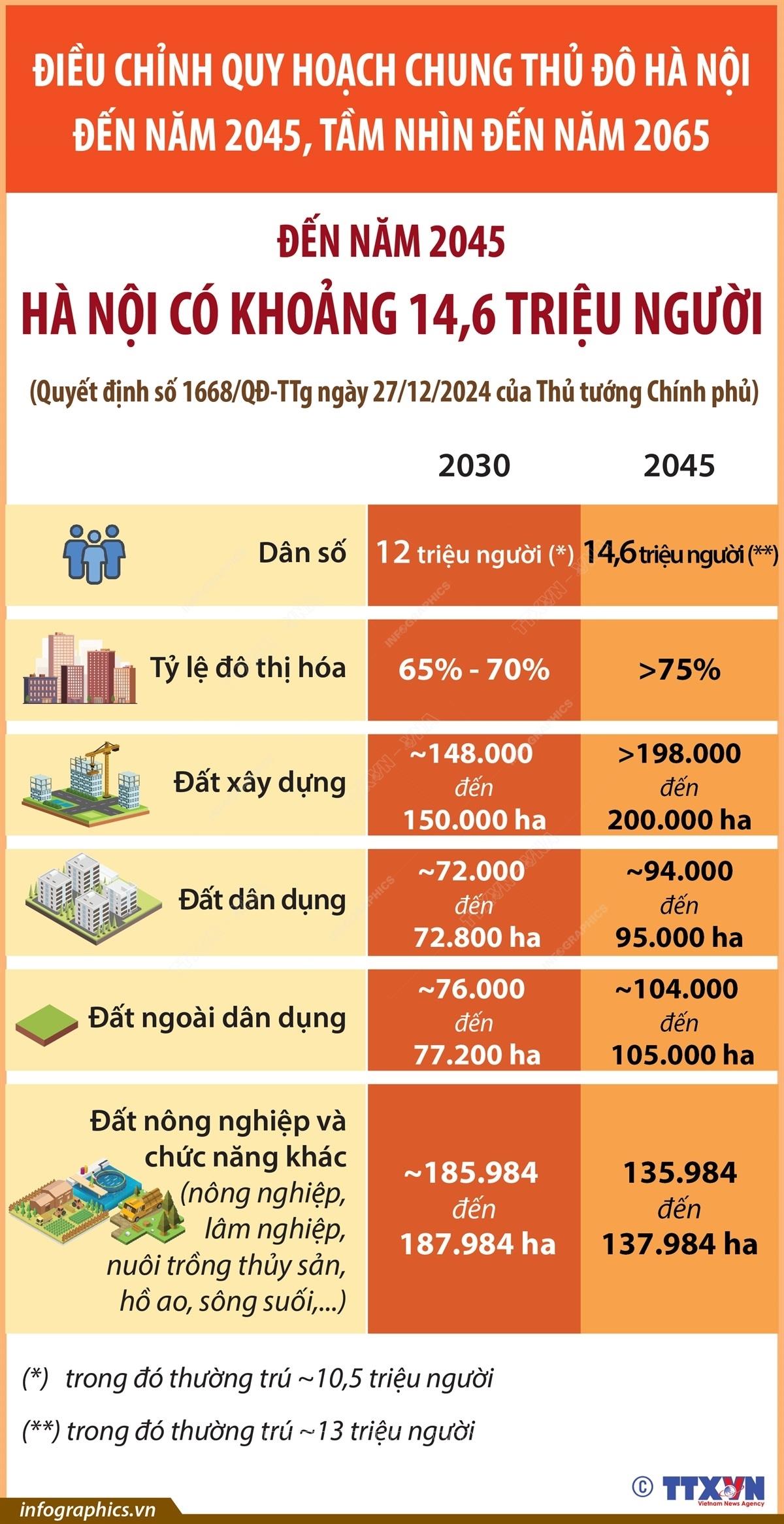 Theo Quyết định số 1668/QĐ-TTg, ngày 27/12/2024 của Thủ tướng Chính phủ phê duyệt Điều chỉnh Quy hoạch chung Thủ đô Hà Nội đến năm 2045, tầm nhìn đến năm 2065, dự báo dân số của Thủ đô Hà Nội đến năm 2030 là 12 triệu người và đến năm 2045 tăng lên 14,6 triệu người.
