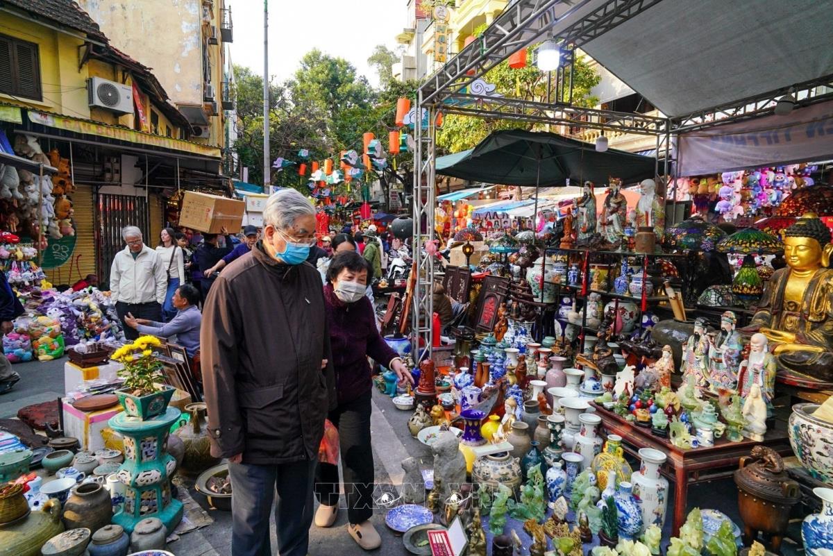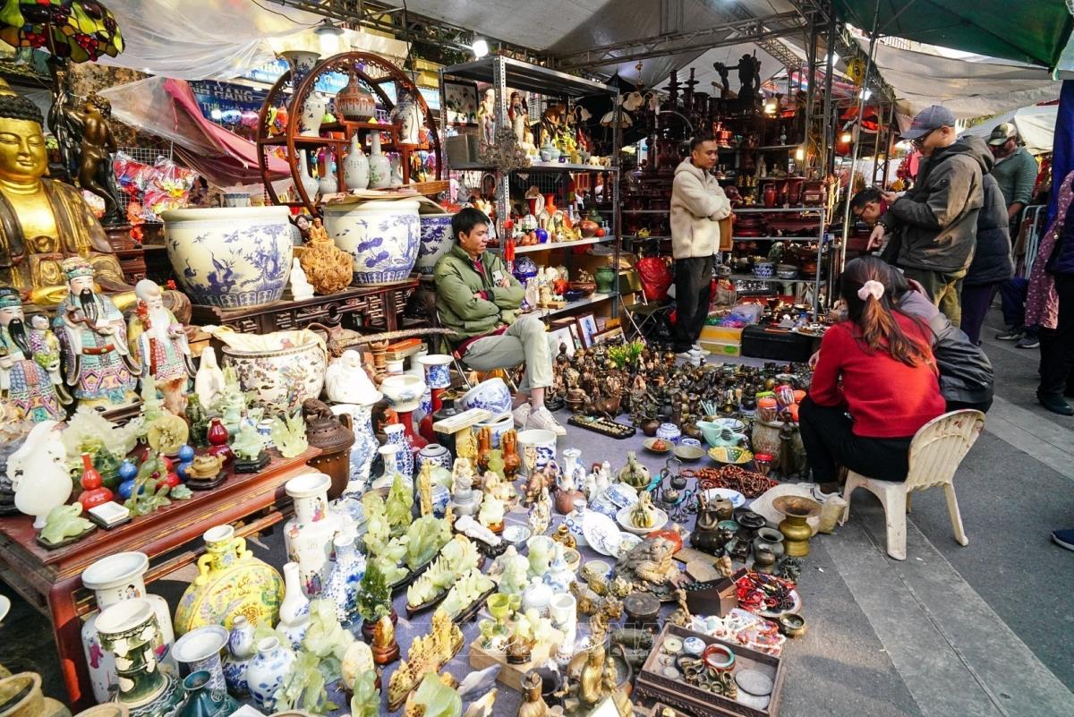 Những gian hàng bán đồ cũ luôn là điểm nhấn không thể bỏ qua khi đến với chợ hoa Hàng Lược (27/1/2025). Ảnh: Khánh Hoà - TTXVN