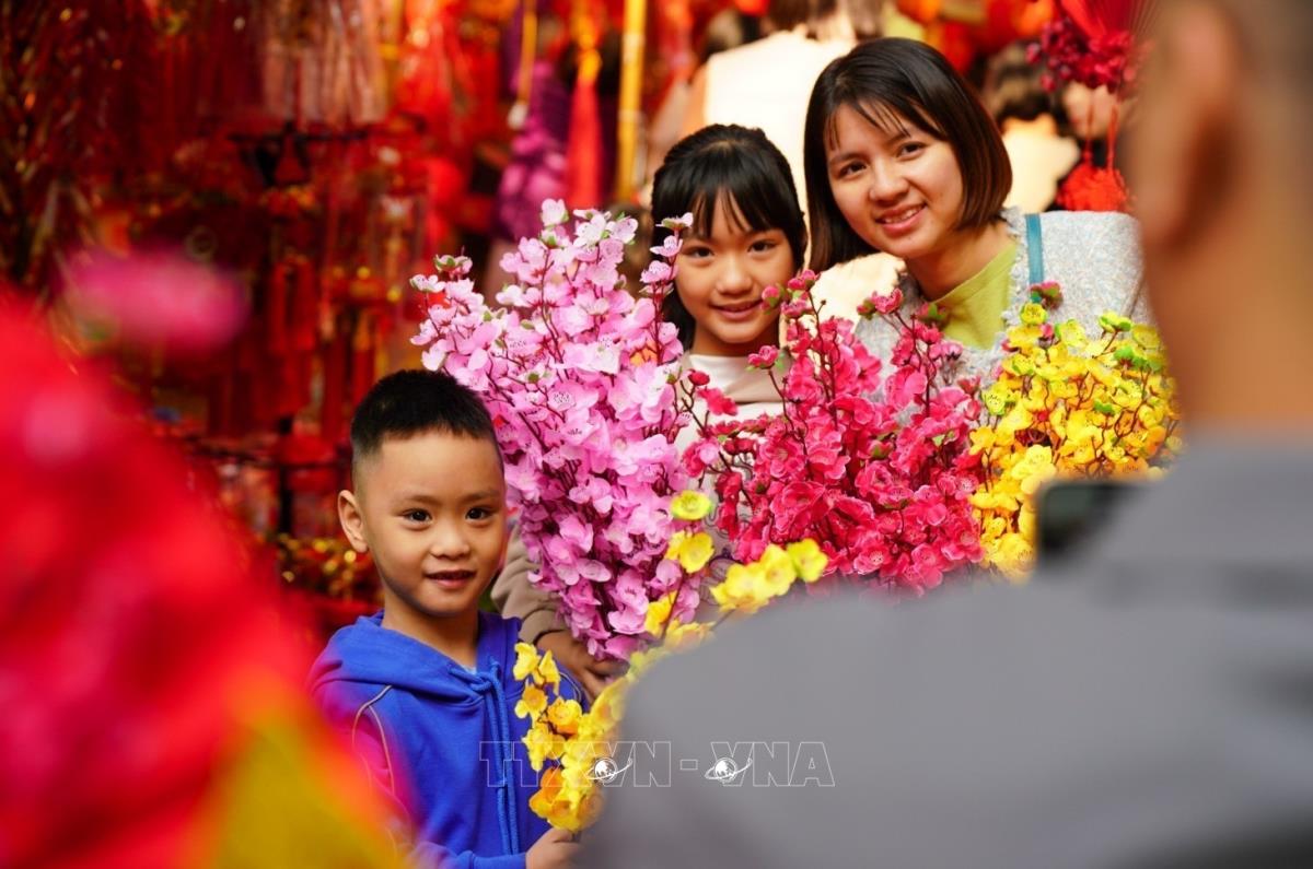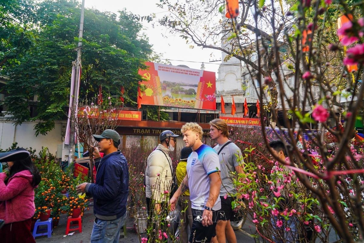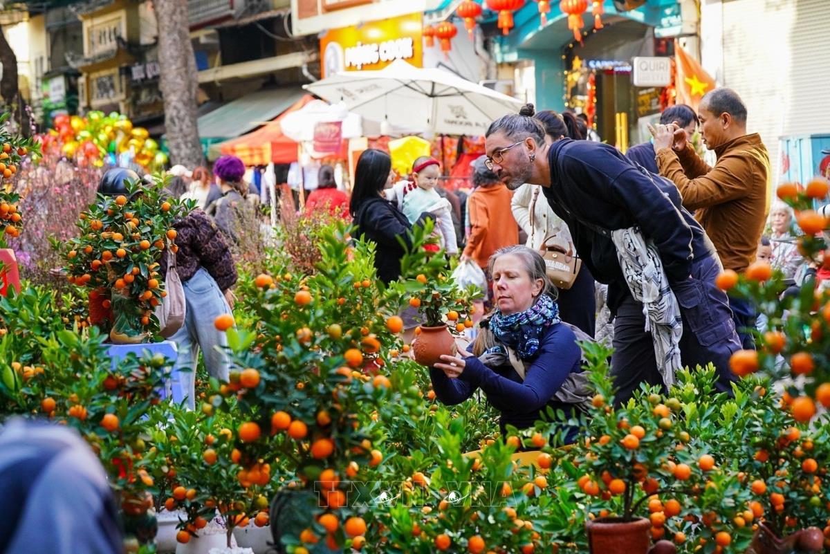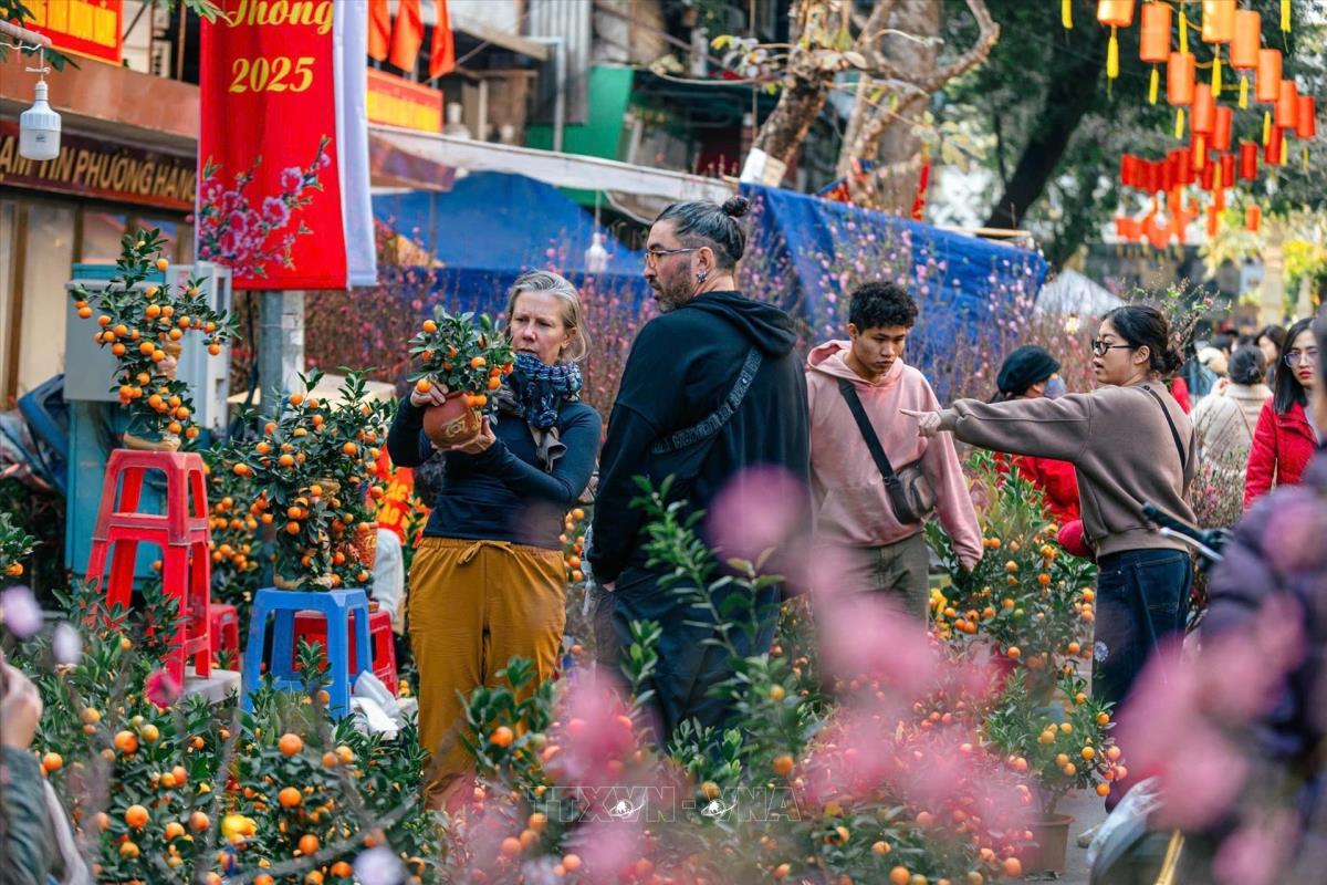 Du khách nước ngoài hoà cùng không khí sắm Tết với người Việt Nam (27/1/2025). Ảnh: Khánh Hoà - TTXVN