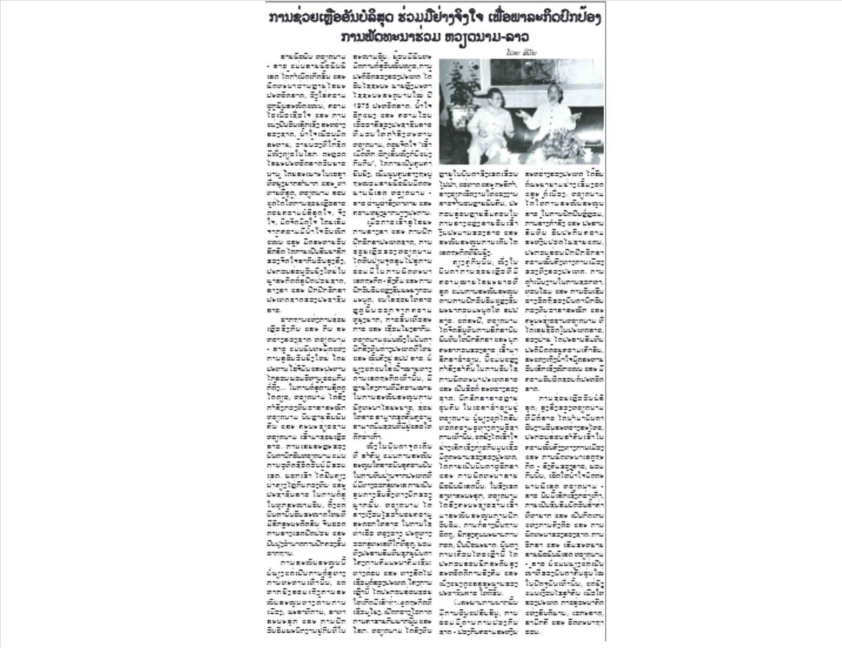 Trong khi đó, chùm 3 bài viết trên trang điện tử của tờ Pathetlao của Hãng Thông tấn Lào, khẳng định “Di sản lịch sử và giá trị thiêng liêng của quan hệ đặc biệt Lào – Việt Nam”, cũng như nhấn mạnh quan hệ Lào - Việt Nam là mối quan hệ đặc biệt, mẫu mực và chân thành, hiếm có trong lịch sử thế giới. Đây không chỉ là tình láng giềng “núi liền núi, sông liền sông”, mà còn là tình đoàn kết anh em được xây dựng bằng mồ hôi, xương máu và những hy sinh cao cả của các thế hệ cán bộ cách mạng và nhân dân hai nước. Trải qua thời gian và thử thách, tình hữu nghị vĩ đại, đoàn kết đặc biệt và hợp tác toàn diện Lào – Việt Nam đã trở thành di sản quý báu, là quy luật cốt lõi, là nền tảng ổn định của hai dân tộc.