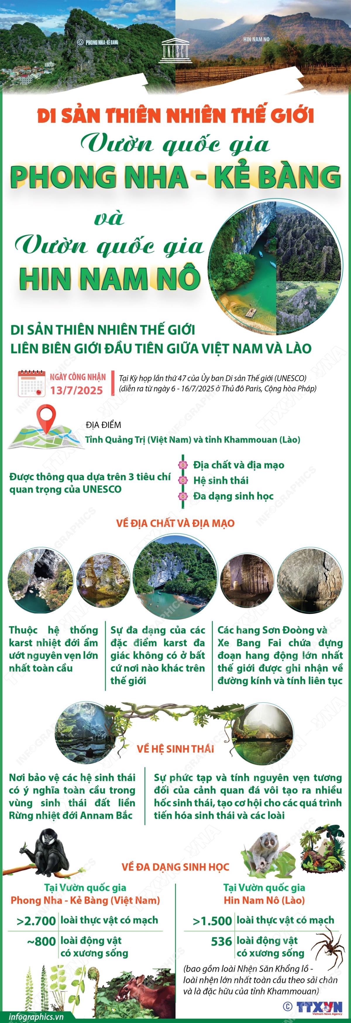 Hà Nội (TTXVN 14/7/2025) Ngày 13/7/2025, tại Kỳ họp lần thứ 47 của Ủy ban Di sản Thế giới ở Thủ đô Paris (Pháp), UNESCO đã chính thức thông qua quyết định điều chỉnh ranh giới Di sản Thiên nhiên Thế giới Vườn quốc gia Phong Nha - Kẻ Bàng, trong đó bao gồm cả Vườn quốc gia Hin Nam Nô của Lào, tạo nên di sản thế giới liên biên giới đầu tiên mang tên "Vườn quốc gia Phong Nha - Kẻ Bàng và Vườn quốc gia Hin Nam Nô". Quyết định có ý nghĩa lịch sử đặc biệt này được thông qua dựa trên 3 tiêu chí quan trọng của UNESCO, gồm địa chất và địa mạo, hệ sinh thái, và đa dạng sinh học.
