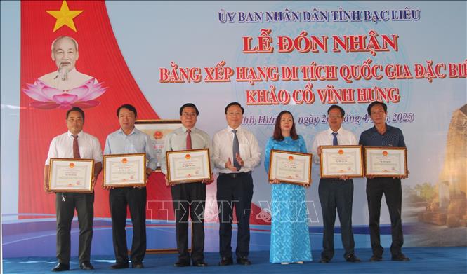 Dịp này, Chủ tịch UBND tỉnh Bạc Liêu tặng Bằng khen cho các tập thể, cá nhân có thành tích tiêu biểu trong thực hiện bảo tồn, phát huy giá trị Di tích và lập hồ sơ Di tích Quốc gia đặc biệt đối với di tích Khảo cổ Vĩnh Hưng./.