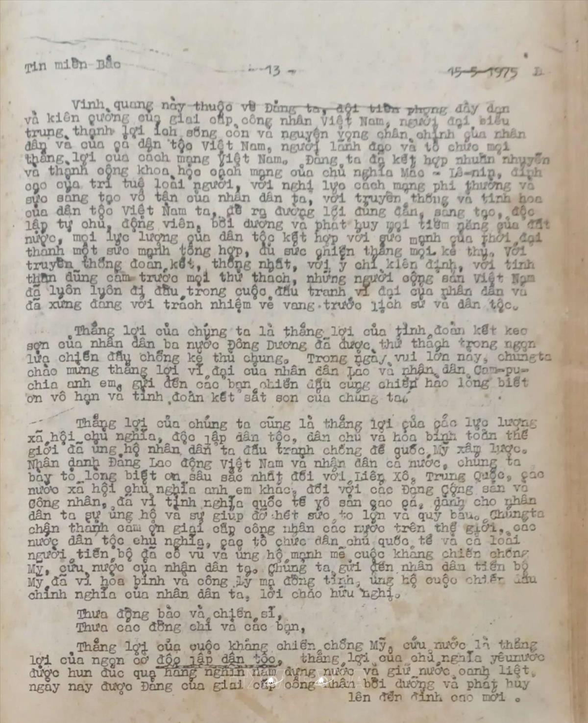 Sự kiện Diễn văn của đồng chí Lê Duẩn, Bí thư thứ nhất BCHTƯ Đảng Lao động Việt Nam đọc trong buổi lễ mừng chiến thắng tại Hà Nội ngày 15/5/1975 Nhân vật liên quanBí thư thứ nhất (9/1960 - 12/1976); Tổng Bí thư của Đảng (12/1976 - 7/1986)Lê Duẩn Tin Trong nước (tin miền Bắc) của Việt Nam Thông tấn xã, ngày 15/5/1975 Từ khóa:Giải phóng miền Namthống nhất đất nướcĐồng chí Lê DuẩnDiễn văn mừng chiến thắng 30/4/1975Chiến thắng 30/4/1975