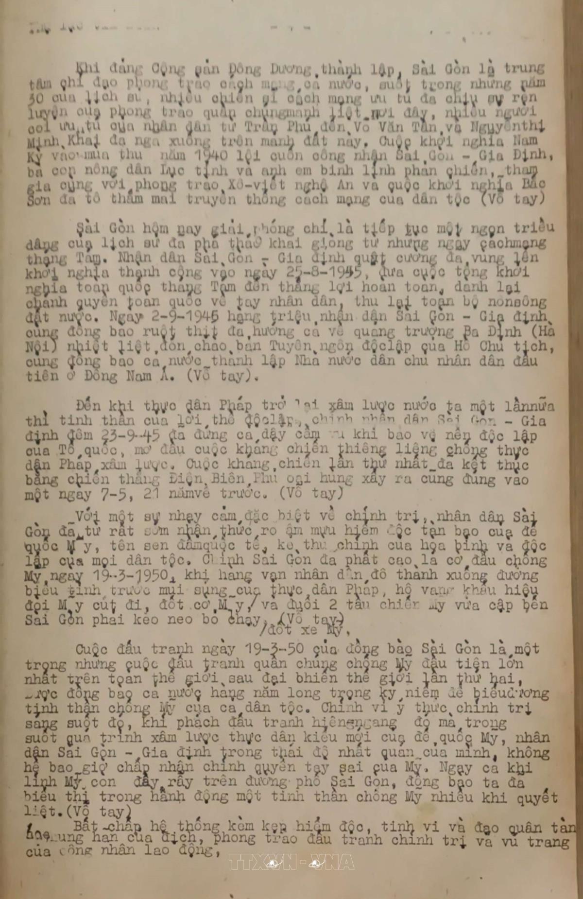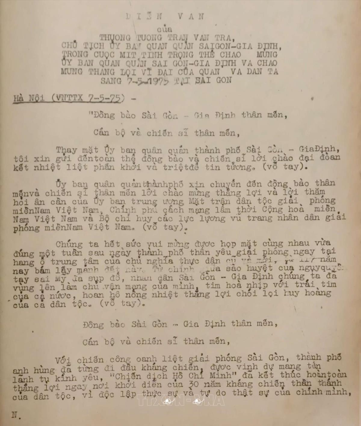 Diễn văn của Thượng tướng Trần Văn Trà, Chủ tịch Ủy ban quân quản Sài Gòn - Gia Định, trong cuộc mít tinh trọng thể chào mừng Ủy ban quân quản Sài Gòn - Gia Định và chào mừng thắng lợi vĩ đại của quân và dân ta, sáng 7/5/1975 tại Sài Gòn