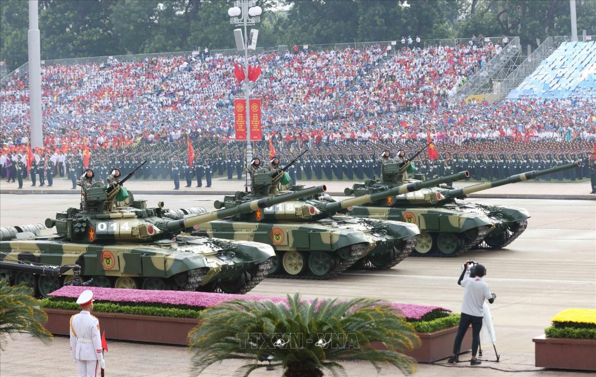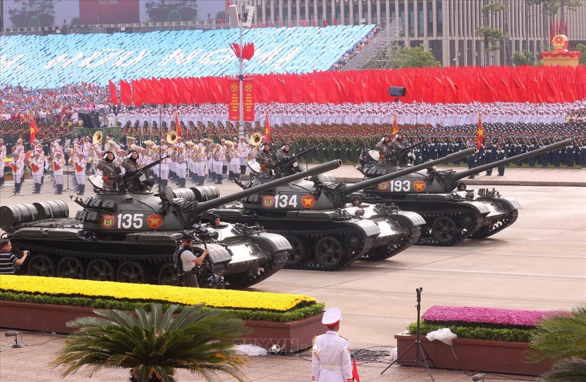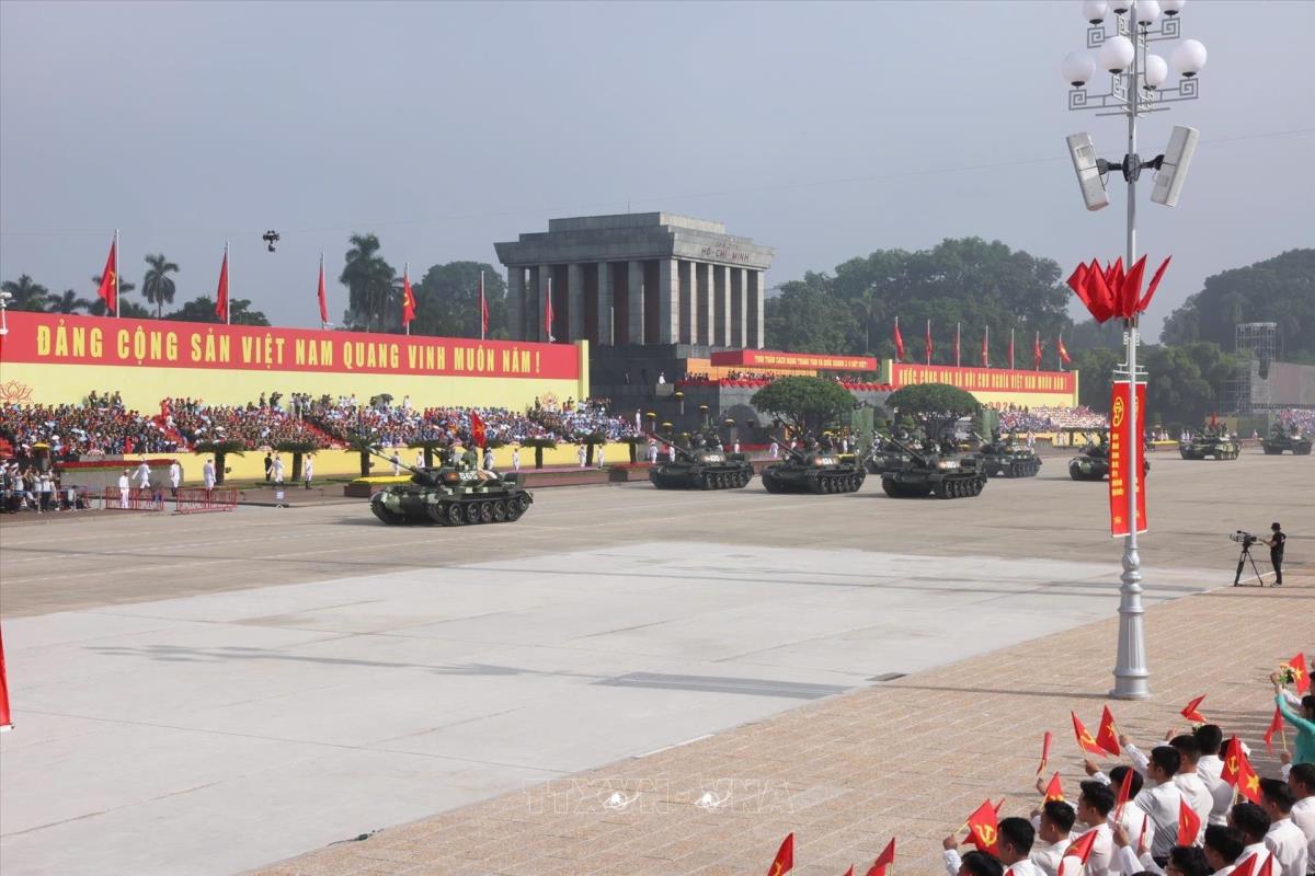Khối xe Tăng thiết giáp diễu qua Lễ đài. Ảnh: Quốc Khánh - TTXVN