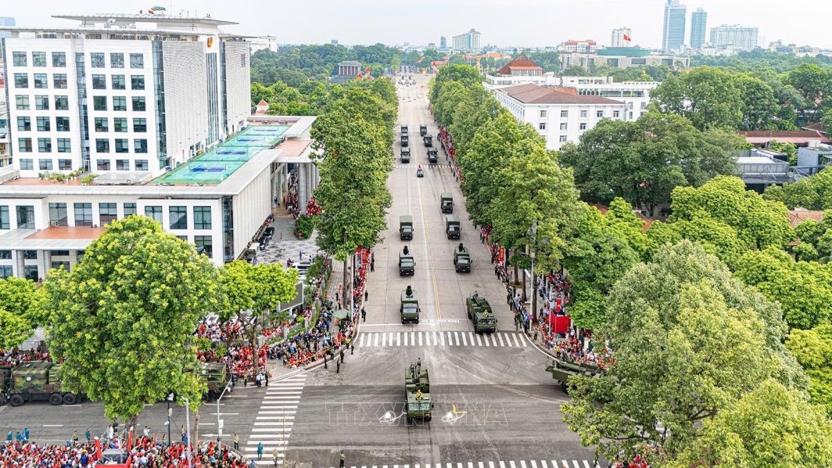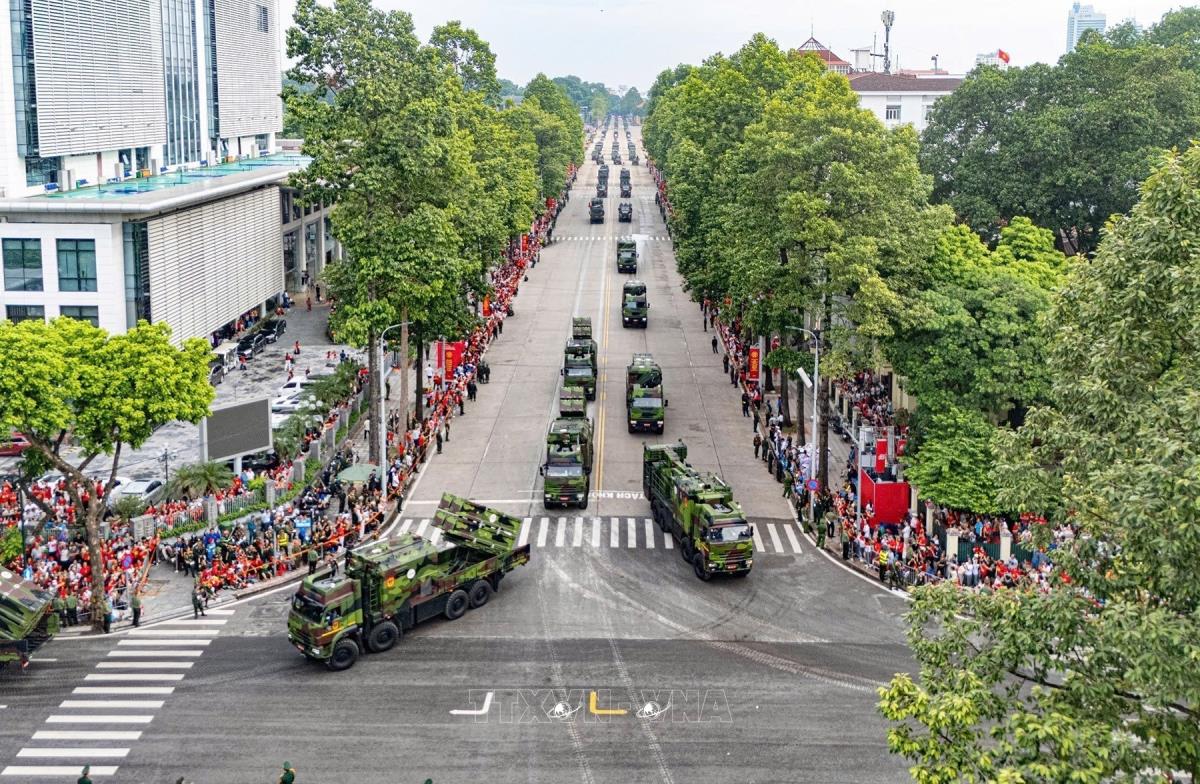 Các khối xe, pháo, khí tài của lực lượng Quân đội diễu binh trên tuyến phố Hùng Vương. Ảnh: TTXVN