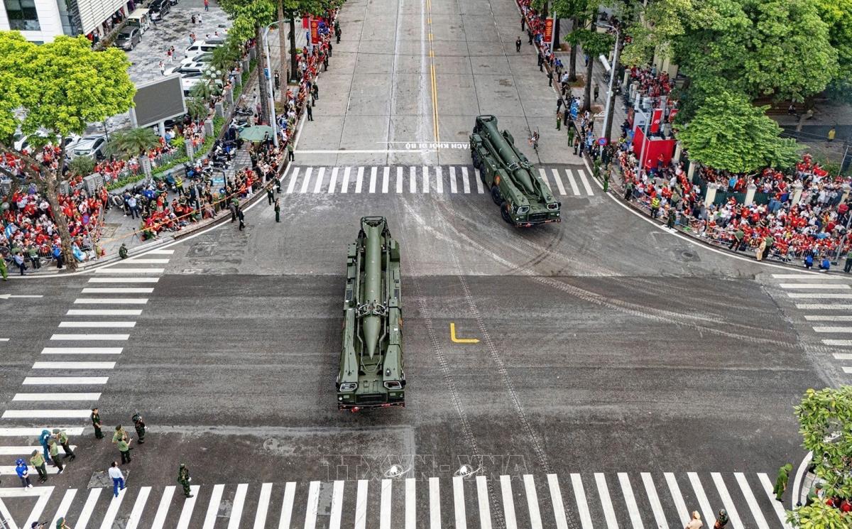 Tổ hợp tên lửa đạn đạo Scud-B với tên lửa đối đất R-17E diễu binh trên tuyến đường Hùng Vương. Ảnh: TTXVN