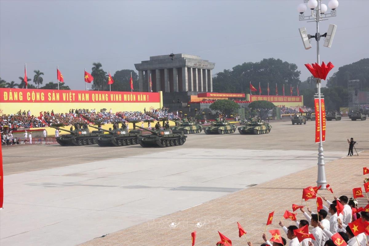 Lực lượng xe, pháo của Quân đội diễu binh trên tuyến đường Hùng Vương. Ảnh: TTXVN