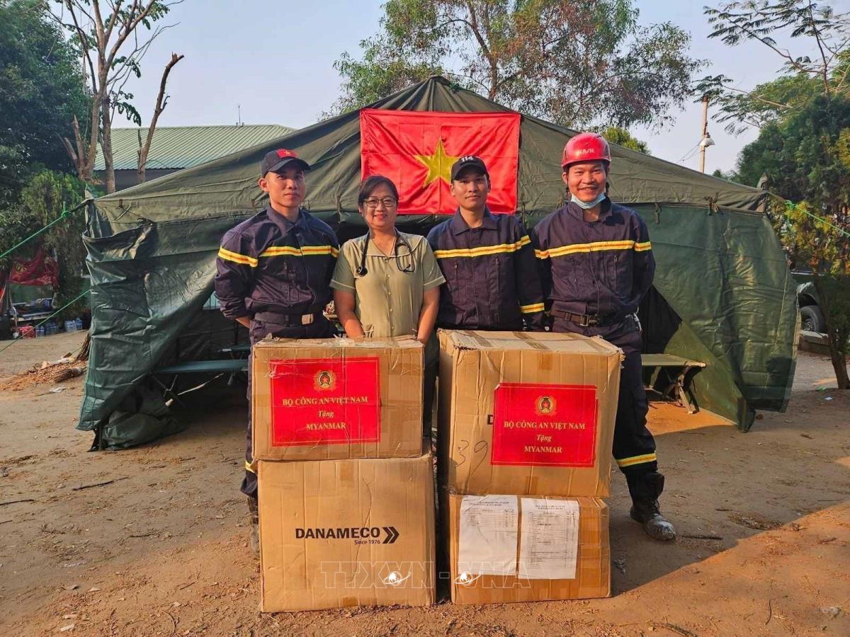 Chiều 5/4/2025, song song với tổ công tác thực hiện nhiệm vụ tìm kiếm nạn nhân tại Khách sạn Jade City, một tổ công tác của Bộ Công an Việt Nam tập hợp trang thiết bị là nhà bạt, giường cùng vật tư y tế, thuốc và các nhu yếu phẩm thiết yếu như mỳ tôm, lương khô, nước sạch...hỗ trợ người dân Myanmar.