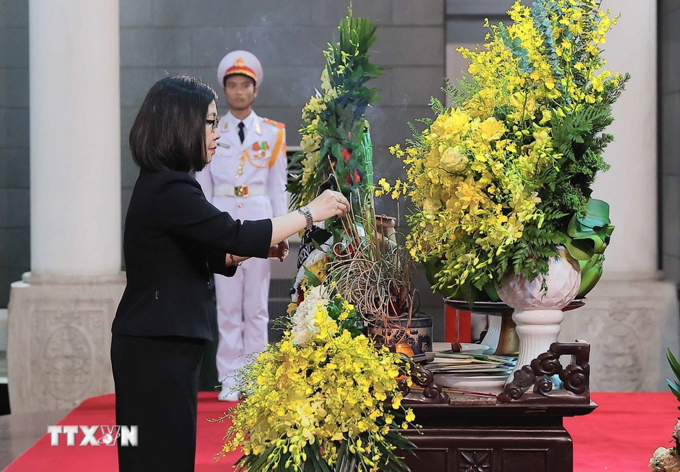 Phó Tổng Giám đốc Thông tấn xã Việt Nam Đoàn Thị Tuyết Nhung dẫn đầu vào viếng nguyên Chủ tịch nước Trần Đức Lương, ngày 24/5/2025. (Ảnh: TTXVN)