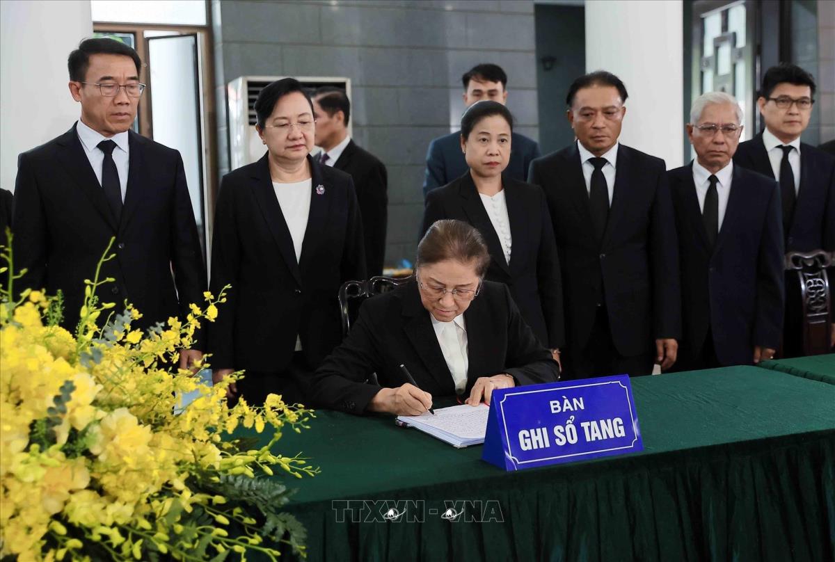 Phó Chủ tịch nước Lào Pany Yathotou ghi sổ tang tại lễ viếng nguyên Chủ tịch nước Trần Đức Lương (24/5/2025). Ảnh: TTXVN