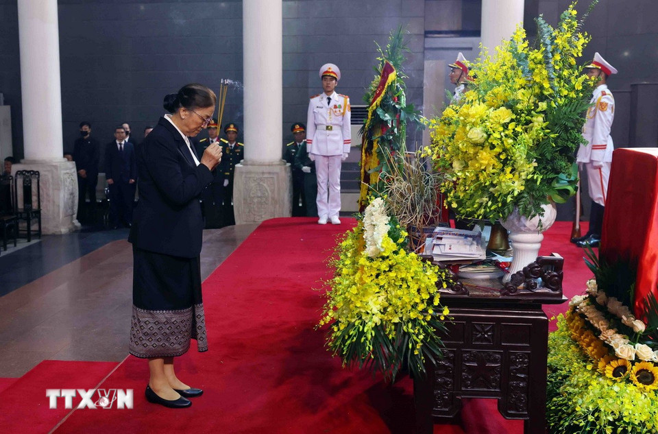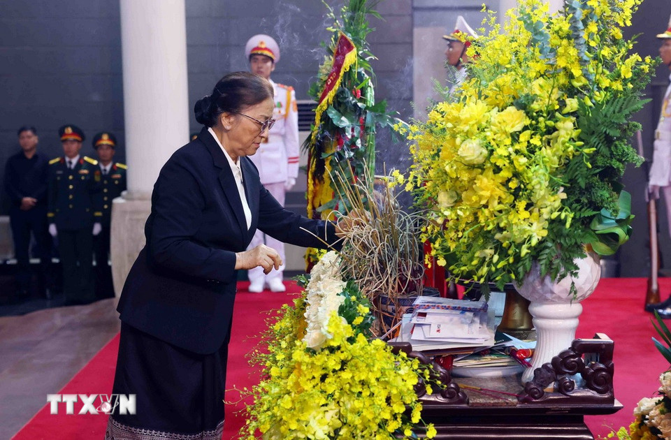 Phó Chủ tịch nước Lào Pany Yathotou chia buồn cùng gia đình nguyên Chủ tịch nước Trần Đức Lương (24/5/2025). Ảnh: TTXVN