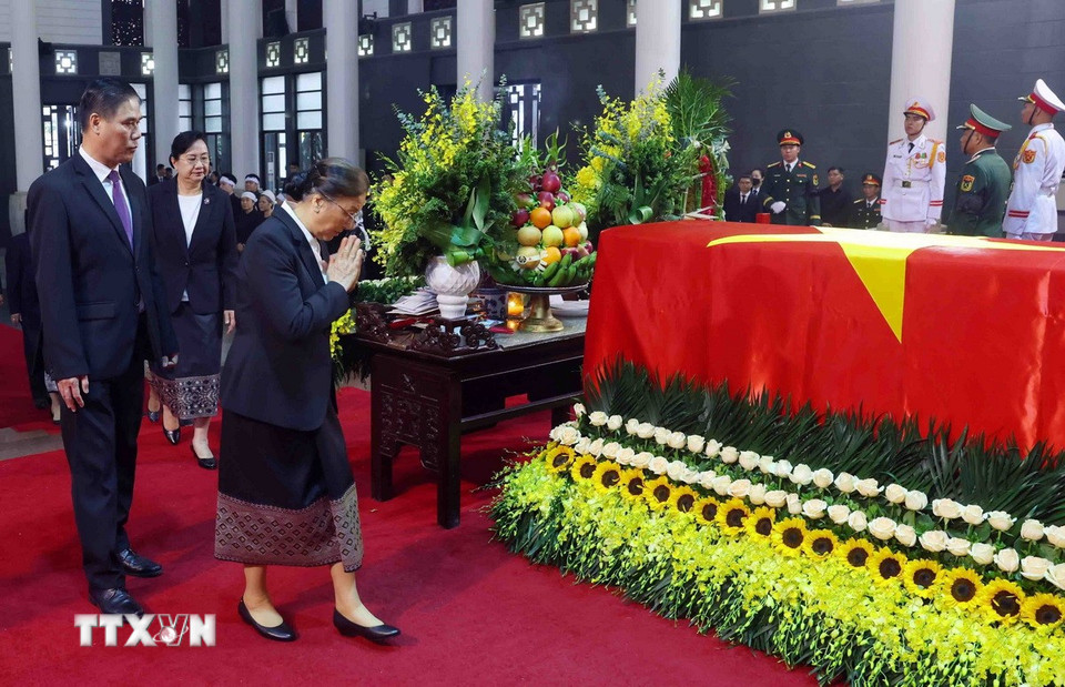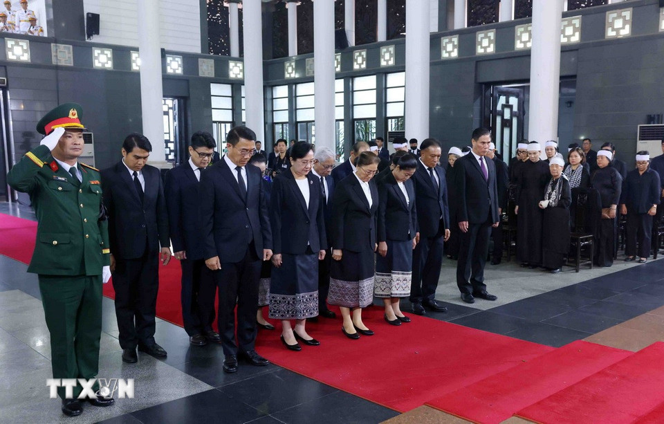 Đoàn đại biểu cấp cao của Đảng Nhân dân Cách mạng Lào do Phó Chủ tịch nước Lào Pany Yathotou dẫn đầu đến viếng nguyên Chủ tịch nước Trần Đức Lương, ngày 24/5/2025. (Ảnh: TTXVN)