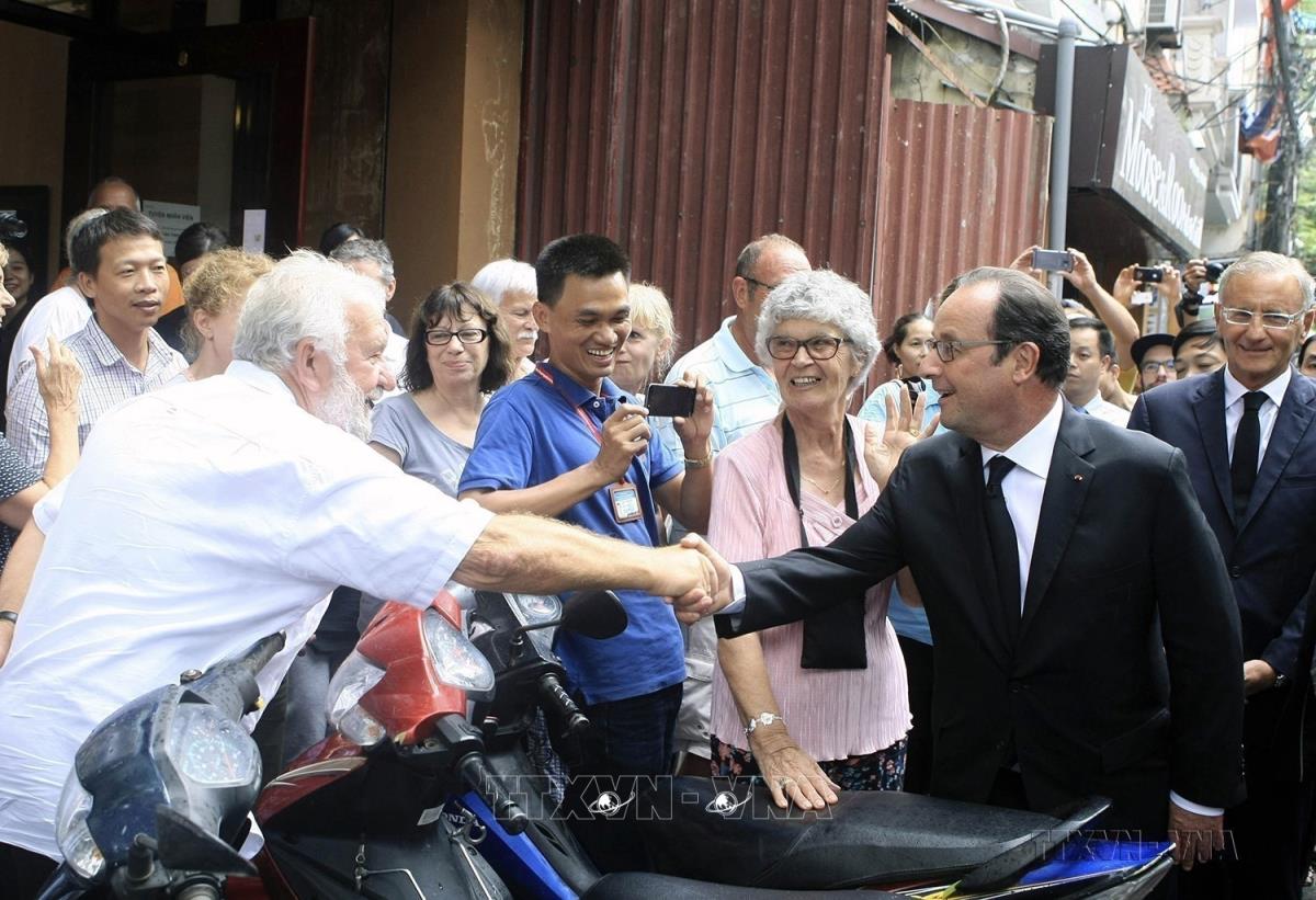 Tổng thống Pháp Francois Hollande gặp gỡ du khách quốc tế tại khu vực phố cổ Hà Nội trong chuyến thăm cấp Nhà nước tới Việt Nam, chiều 6/9/2016. Ảnh: Phạm Kiên - TTXVN