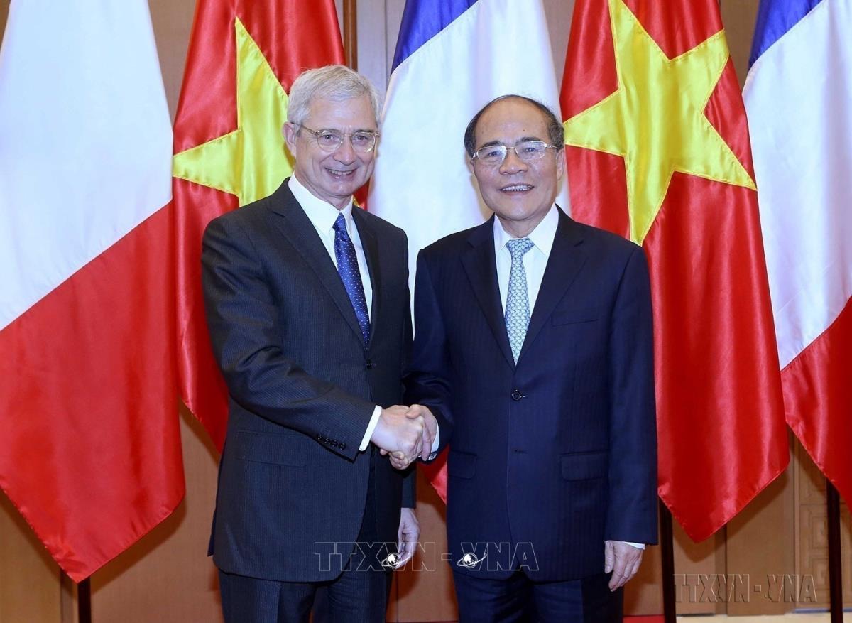 Chủ tịch Quốc hội Nguyễn Sinh Hùng đón Chủ tịch Quốc hội Pháp Claude Bartolone thăm chính thức Việt Nam (Hà Nội, 18/3/2016). Ảnh: Nhan Sáng-TTXVN