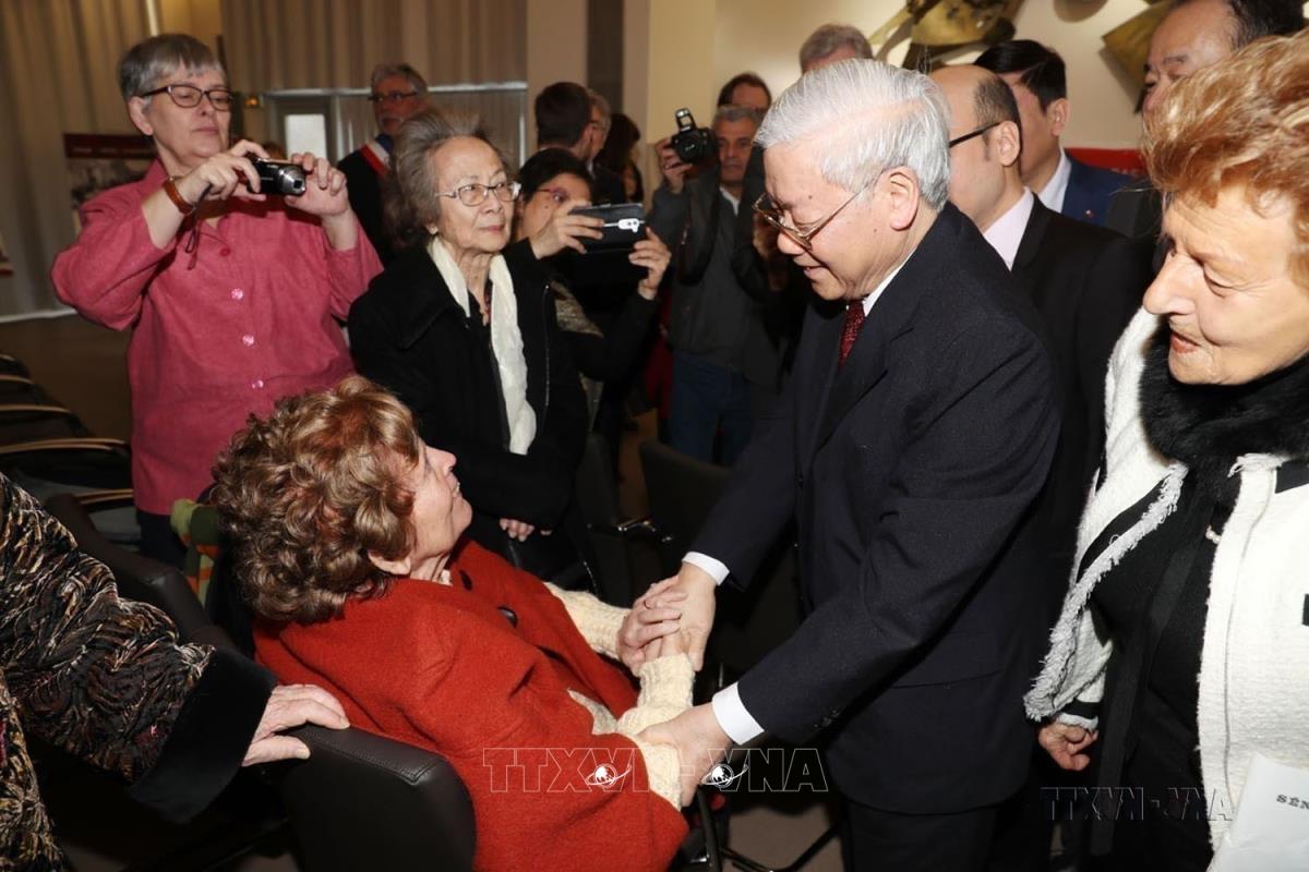 Tổng Bí thư Nguyễn Phú Trọng gặp bà Raymonde Dien - đảng viên Đảng Cộng sản Pháp, một biểu tượng của tinh thần chống cuộc chiến phi nghĩa do thực dân Pháp tiến hành ở Việt Nam, tại Tòa thị chính Choisy Le Roi nhân chuyến thăm chính thức Cộng hoà Pháp, ngày 26/3/2018. Ảnh: Trí Dũng-TTXVN