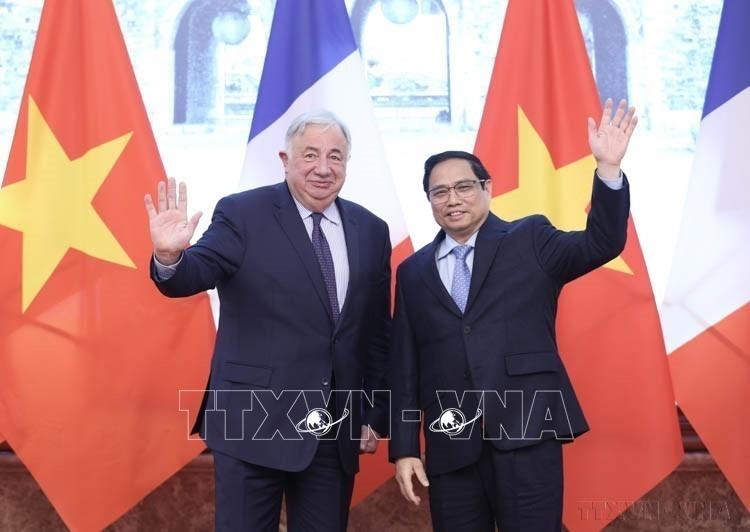 Thủ tướng Phạm Minh Chính tiếp Chủ tịch Thượng viện Cộng hòa Pháp Gérard Larcher (Hà Nội, 8/12/2022). Ảnh: Dương Giang - TTXVN