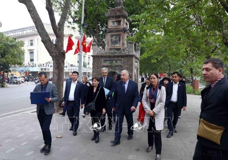 Chủ tịch Thượng viện Cộng hòa Pháp Gérard Larcher tham quan một số địa điểm tại khu vực phố cổ, trung tâm quận Hoàn Kiếm (Hà Nội, 9/12/2022). Ảnh: Phạm Kiên - TTXVN