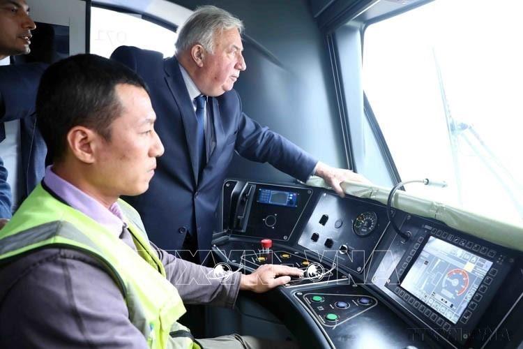 Trong chương trình thăm chính thức Việt Nam, Chủ tịch Thượng viện Cộng hòa Pháp Gérard Larcher khảo sát dự án tuyến đường sắt đô thị số 3 (Hà Nội, 9/12/2022). Ảnh: Phạm Kiên - TTXVN