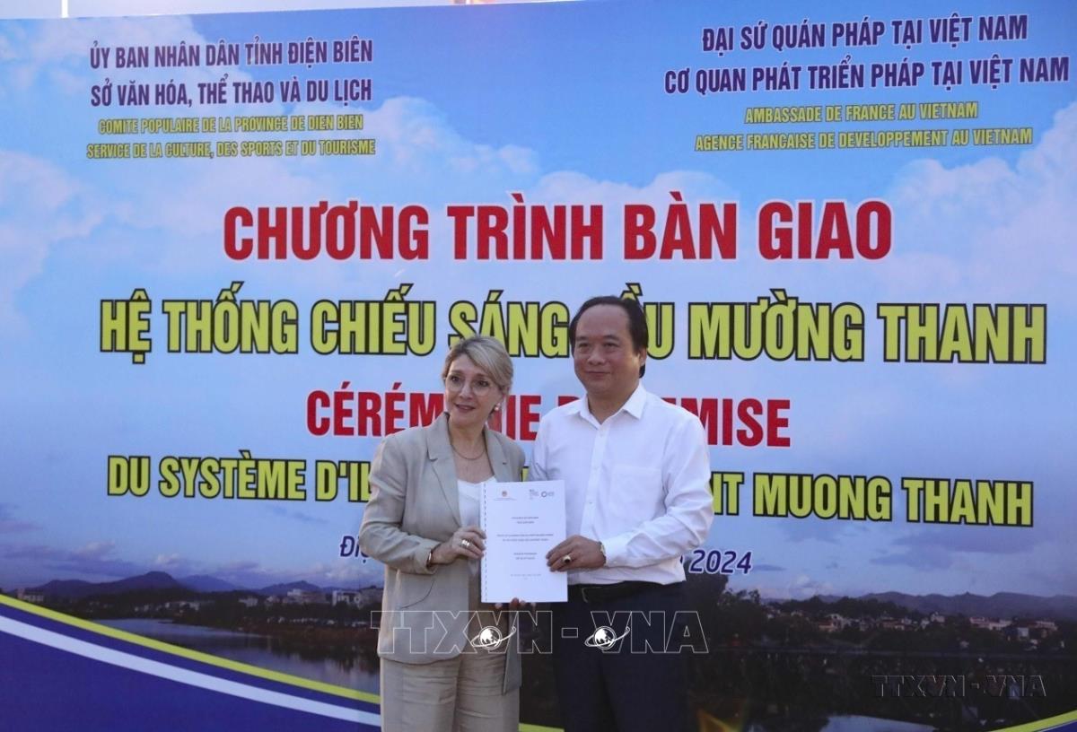 Đại diện Cơ quan Phát triển Pháp tại Việt Nam bàn giao Hồ sơ kỹ thuật Hệ thống chiếu sáng cầu Mường Thanh cho tỉnh Điện Biên. Công trình chào mừng kỷ niệm 70 năm Chiến thắng Điện Biên Phủ (5/5/2024). Ảnh: Xuân Tư - TTXVN