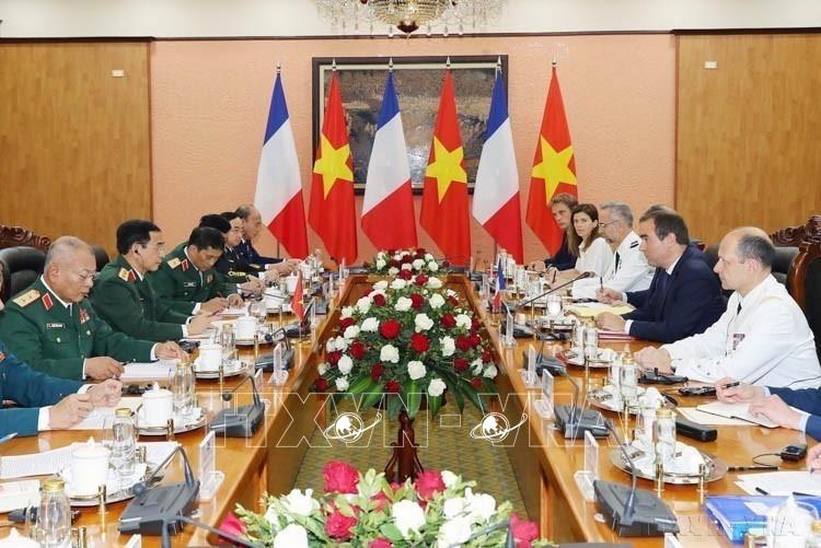 Đại tướng Phan Văn Giang, Bộ trưởng Bộ Quốc phòng hội đàm với Bộ trưởng Quân đội Cộng hòa Pháp Sébastien Lecornu thăm chính thức Việt Nam (05/05/2024). Ảnh: Trọng Đức - TTXVN