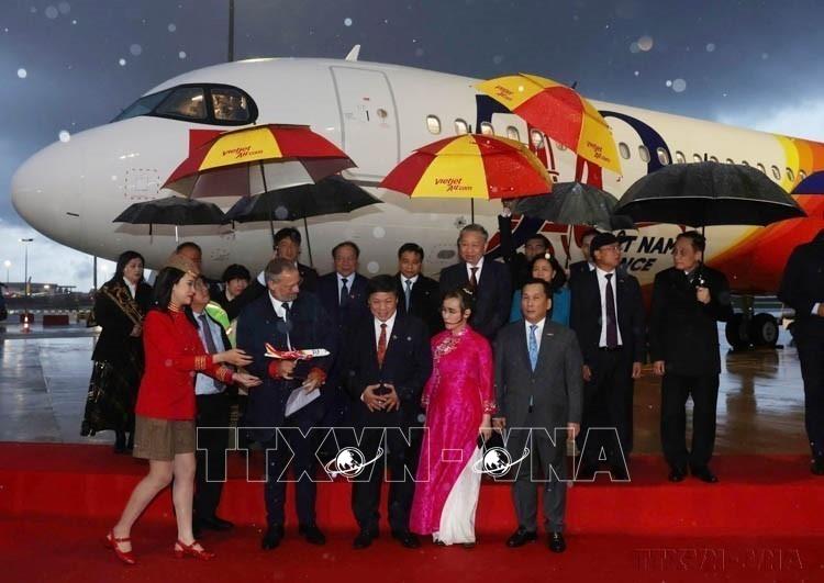 Tối 7/10/2024, tại sân bay Orly, thủ đô Paris (Pháp), Tổng Bí thư, Chủ tịch nước Tô Lâm chứng kiến Airbus và Vietjet bàn giao tàu bay mới mang hình ảnh kỷ niệm 50 năm quan hệ ngoại giao Việt Nam – Pháp. Ảnh: Trí Dũng – TTXVN