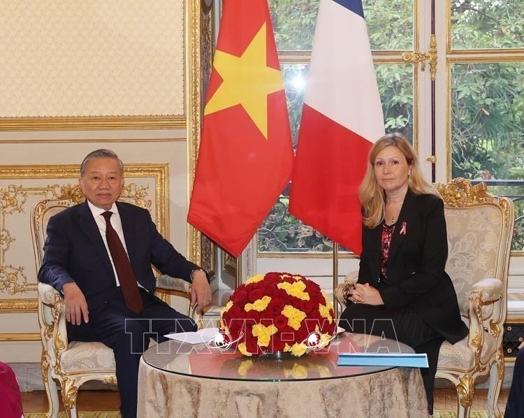 Tổng Bí thư, Chủ tịch nước Tô Lâm hội kiến Chủ tịch Quốc hội Pháp Yaël Braun-Pivet trong chuyến thăm chính thức Cộng hòa Pháp (07/10/2024). Ảnh: Trí Dũng – TTXVN