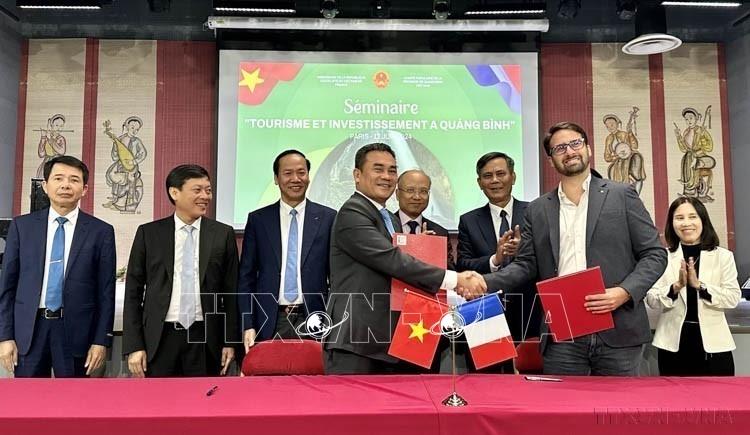 Lễ ký kết Bản ghi nhớ về hợp tác giữa lãnh đạo Sở du lịch tỉnh Quảng Bình và đại diện Công ty Viettravel tại Pháp (Paris, 12/6/2024). Ảnh: Nguyễn Thu Hà - TTXVN
