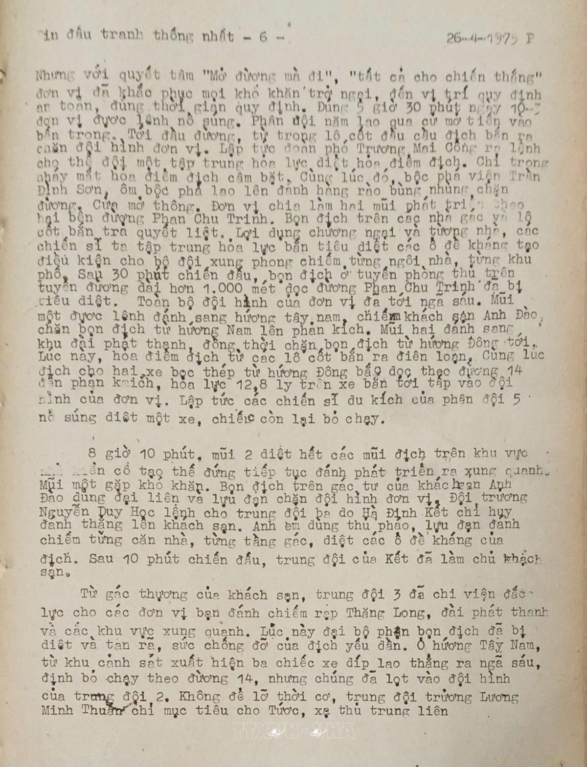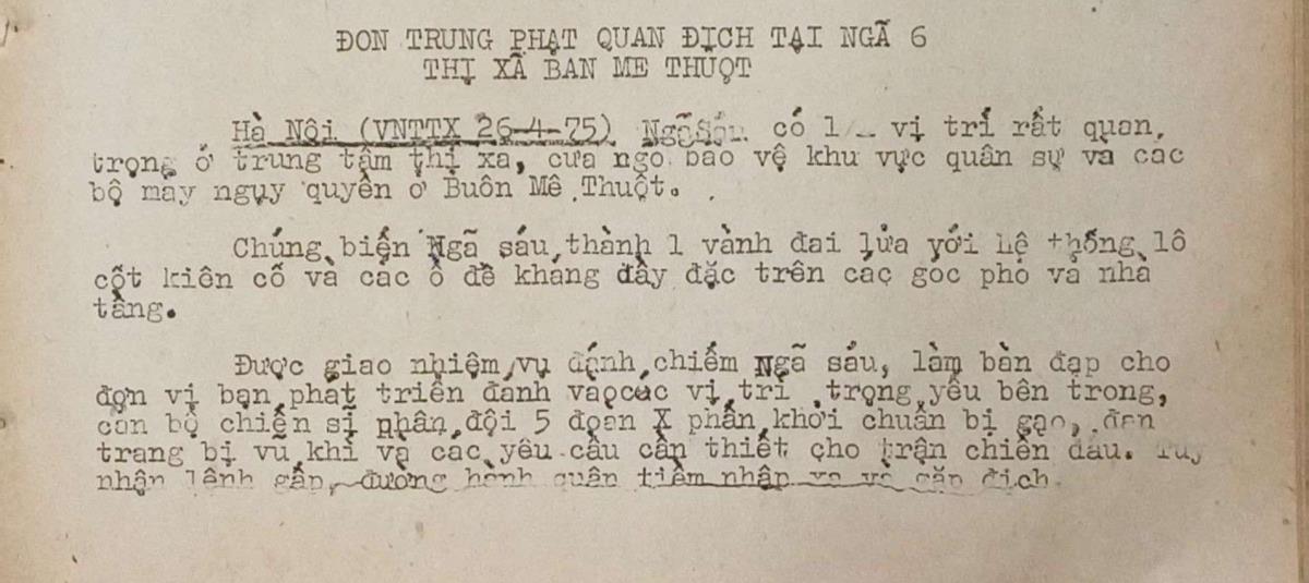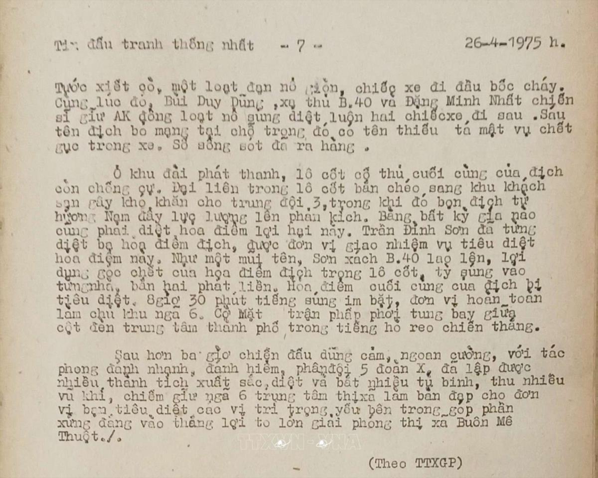 Đòn trừng phạt quân địch tại ngã 6 thị xã Buôn Mê Thuột Tin đấu tranh thống nhất của Việt Nam Thông tấn xã, ngày 26/4/1975 Từ khóa:Giải phóng miền Namthống nhất đất nướcThông tấn xã Giải phóngBuôn Mê Thuột