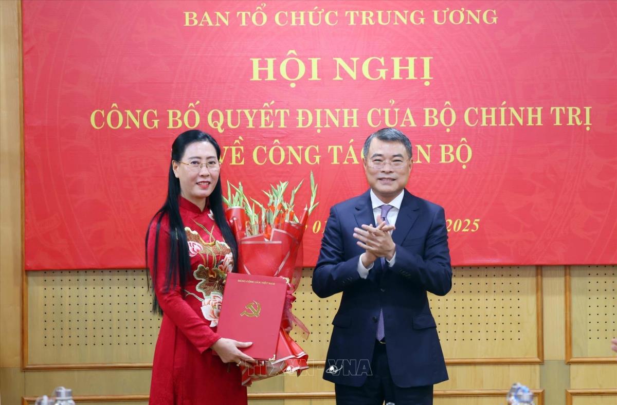 Đồng chí Lê Minh Hưng, Ủy viên Bộ Chính trị, Bí thư Trung ương Đảng, Trưởng ban Tổ chức Trung ương trao Quyết định của Bộ Chính trị về việc phân công, bổ nhiệm đồng chí Bùi Thị Quỳnh Vân giữ chức Phó Trưởng Ban Tổ chức Trung ương (1/10/2025). Ảnh: Phạm Kiên – TTXVN
