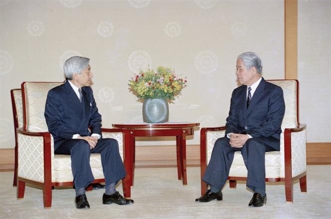 Tổng Bí thư Đỗ Mười hội kiến Nhật hoàng Akihito tại Hoàng cung, Tokyo, Nhật Bản, ngày 19/4/1995. Ảnh: Xuân Lâm-TTXVN