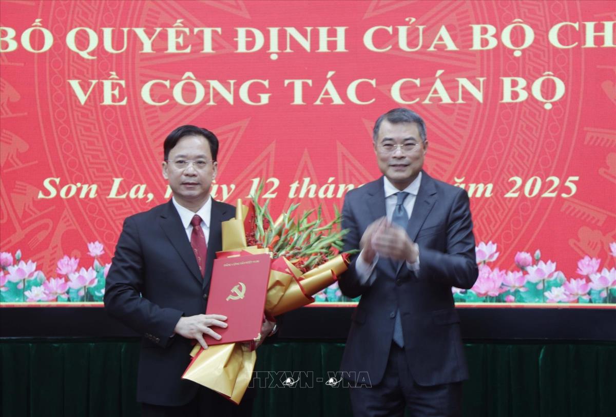 Đồng chí Lê Minh Hưng, Ủy viên Bộ Chính trị, Bí thư Trung ương Đảng, Trưởng Ban Tổ chức Trung ương trao Quyết định cho tân Bí thư Tỉnh ủy Sơn La Hoàng Văn Nghiệm (12/10/2025). Ảnh: Nguyễn Cường - TTXVN