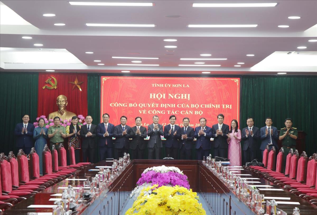 Đồng chí Lê Minh Hưng, Ủy viên Bộ Chính trị, Bí thư Trung ương Đảng, Trưởng Ban Tổ chức Trung ương cùng tập thể Ban Thường vụ Tỉnh ủy Sơn La chúc mừng tân Bí thư Tỉnh ủy Sơn La Hoàng Văn Nghiệm (12/10/2025). Ảnh: Nguyễn Cường - TTXVN