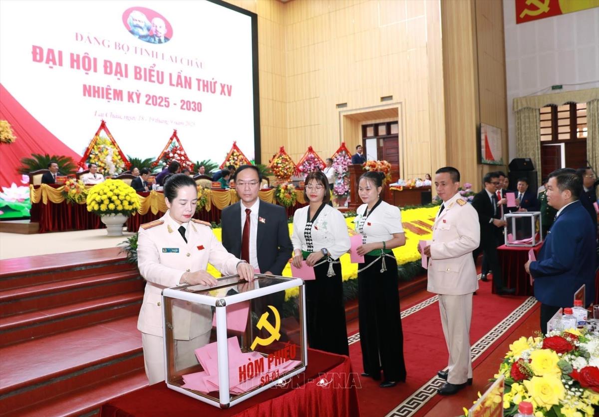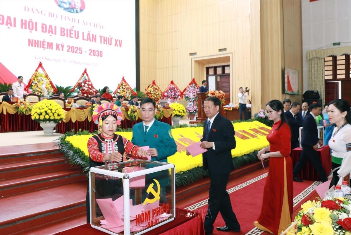 Đồng chí Giàng Páo Mỷ, Ủy viên Trung ương Đảng, Bí thư Tỉnh ủy Lai Châu nhiệm kỳ 2020 - 2025 và Bí thư Tỉnh ủy Lai Châu nhiệm kỳ 2025 - 2030 Lê Minh Ngân bỏ phiếu bầu Đoàn đại biểu đi dự Đại hội đại biểu toàn quốc lần thứ XIV của Đảng (19/9/2025). Ảnh: Quý Trung – TTXVN
