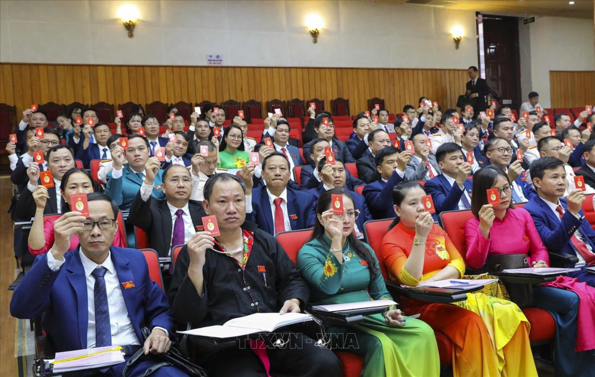 Đại biểu biểu quyết thông qua Nghị quyết Đại hội (16/10/2025). Ảnh: Xuân Tư - TTXVN