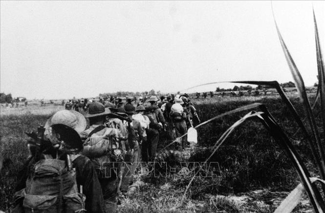 Chiến sĩ bộ binh Trung đoàn 201, Sư đoàn 302 hành quân qua vùng Đồng Tháp Mười. Ảnh: Tư liệu/TTXVN phát