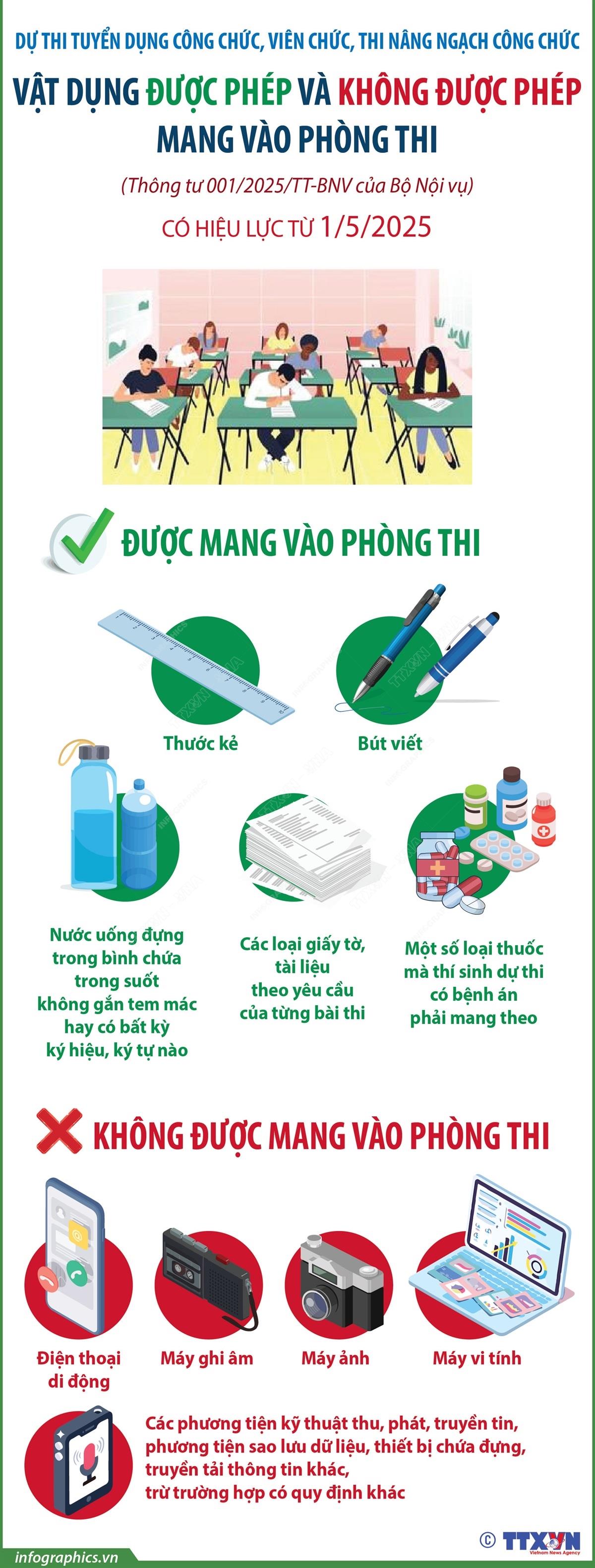 [Infographics] Dự thi tuyển dụng công chức, viên chức, thi nâng ngạch công chức: Vật dụng được phép và không được phép mang vào phòng thi