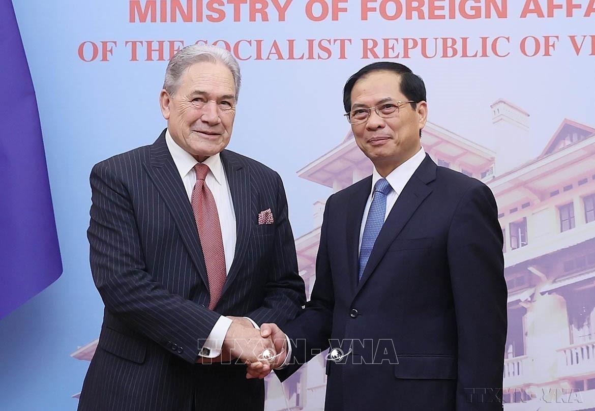 Bộ trưởng Ngoại giao Bùi Thanh Sơn và Phó Thủ tướng, Bộ trưởng Ngoại giao New Zealand Winston Peters đồng chủ trì Hội nghị Bộ trưởng Ngoại giao Việt Nam-New Zealand lần thứ 2 (Hà Nội, 6/5/2024). Ảnh: An Đăng - TTXVN