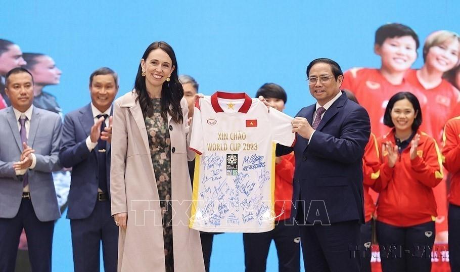 Thủ tướng Phạm Minh Chính và Thủ tướng New Zealand Jacinda Ardern gặp Đội tuyển bóng đá nữ quốc gia Việt Nam nhân dịp tham dự Giải vô địch bóng đá nữ thế giới năm 2023 tại New Zealand và Australia (Hà Nội, 14/11/2022). Ảnh: Dương Giang-TTXVN