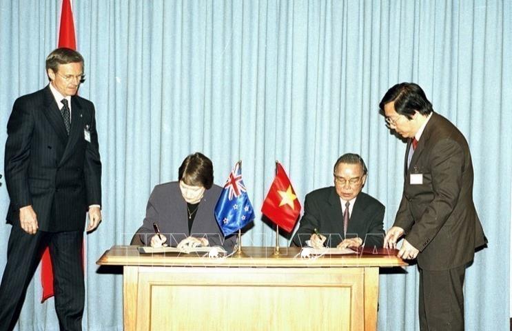 Thủ tướng New Zealand Jim Bolger và Thủ tướng Võ Văn Kiệt ký tắt Hiệp định hợp tác kinh tế, thương mại Việt Nam - New Zealand (1993). Ảnh: Minh Đạo – TTXVN