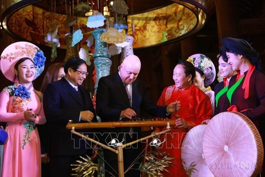 Thủ tướng New Zealand Christopher Luxon cùng Thủ tướng Phạm Minh Chính thăm Khu di tích quốc gia đặc biệt Văn Miếu - Quốc Tử Giám và trải nghiệm nhạc cụ truyền thống Việt Nam (Hà Nội, 27/2/2025). Ảnh: Dương Giang – TTXVN
