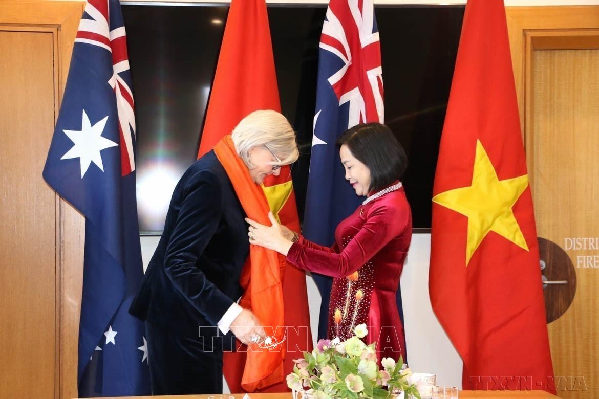 Phó Chủ tịch Quốc hội Nguyễn Thị Thanh trao quà lưu niệm cho Toàn quyền Australia Sam Mostyn (Canberra, 13/09/2024). Ảnh: Thanh Tú - TTXVN