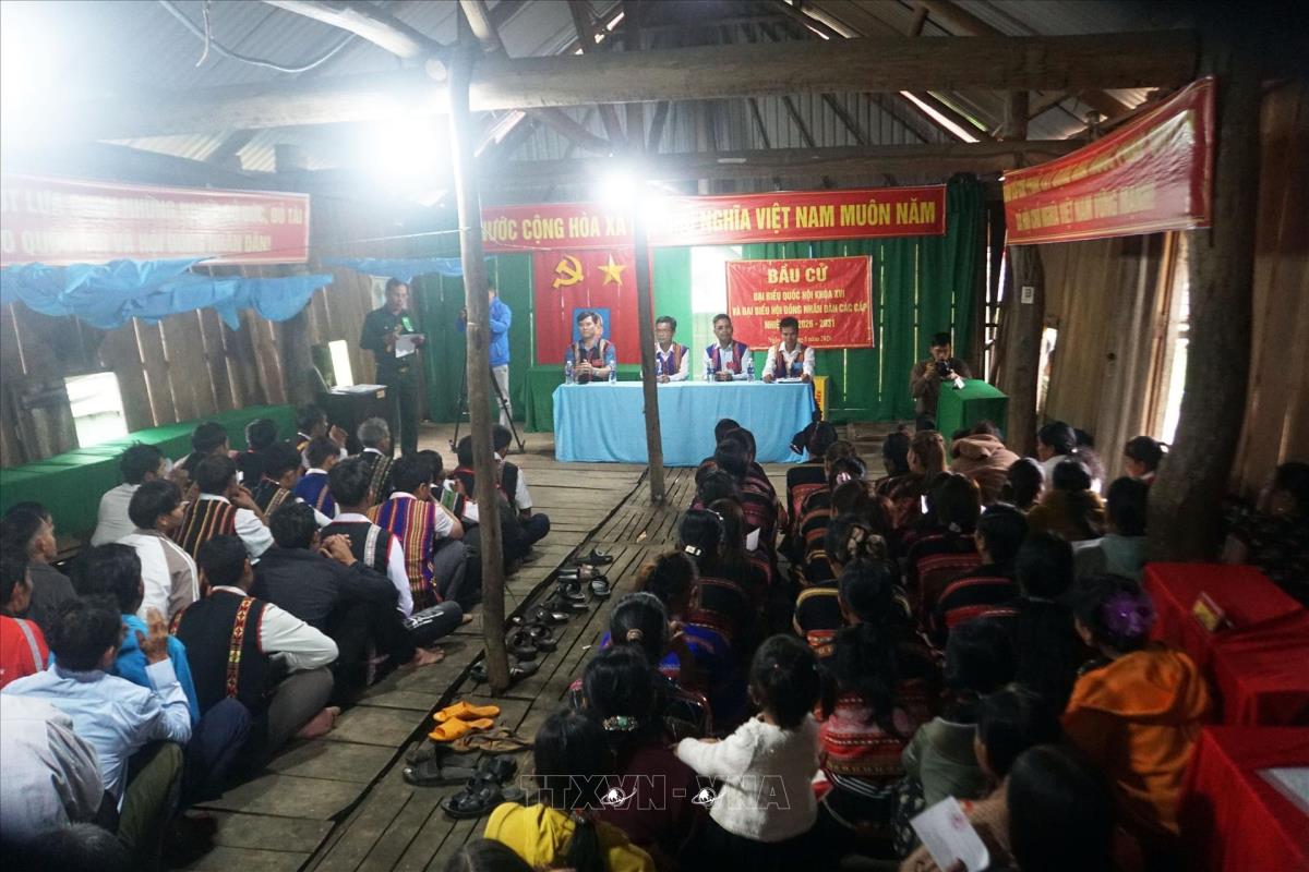 Tổ bầu cử tại làng O2 (Gia Lai) đang phổ biến các quy chế bầu cử cho bà con (14/3/2026). Ảnh: Trịnh Bang Nhiệm - TTXVN